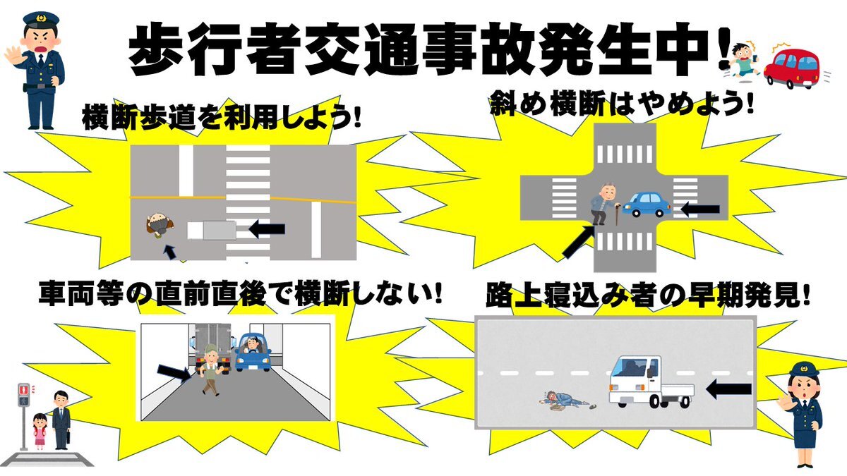 【交通死亡事故が多発しています!!】 県内で4日間に4件の死亡事故が発生しました。交通事故を防ぐため、歩行者もドライバーも交通ルールとマナーを守りましょう。 #交通死亡事故 #道路横断 #自転車 pic.x.com/QDvjr4Ejxu