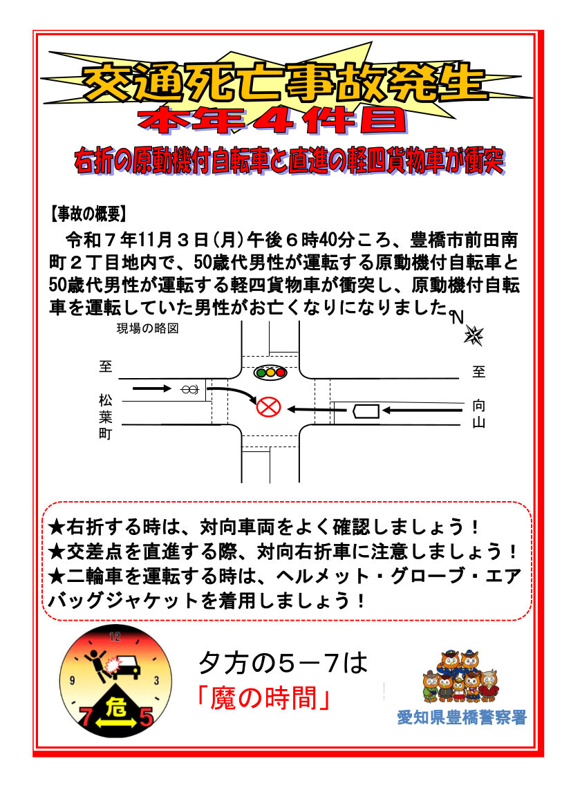 【#豊橋警察署】 #交通死亡事故 発生⚠️ 11月3日(月)午後6時40分ころ、豊橋市前田南町地内の信号交差点を右折する原動機付自転車と、対向から直進する軽四貨物車が衝突し、原動機付自転車を運転していた方が亡くなりました。 夕方の5-7は魔の時間です。 ライトを点灯し、ゆっくり走行しましょう。 pic.x.com/StNP4jIOPz