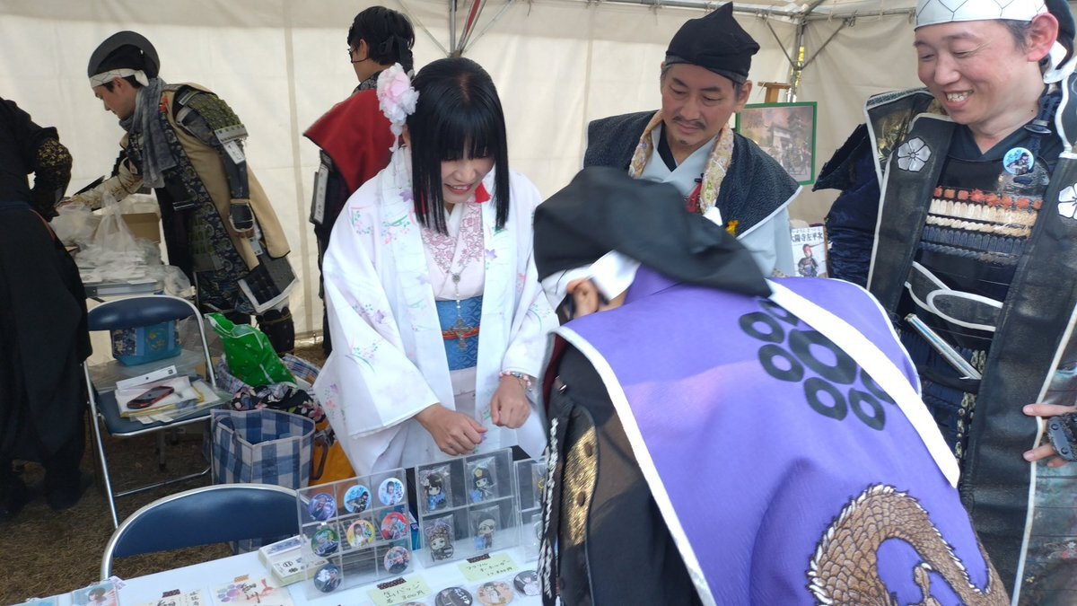 #サムライニンジャフェスティバル2025 にて、#古戦場おもてなし武将隊関ケ原組 の #細川興元 様が、#京都·長岡京おもてなし武将隊つつじ のブースにて、お買い物中の様子。 pic.x.com/Hn5UAPF66R