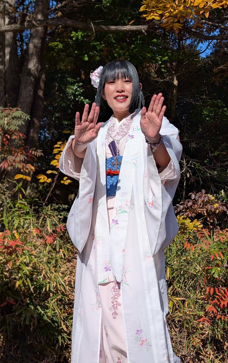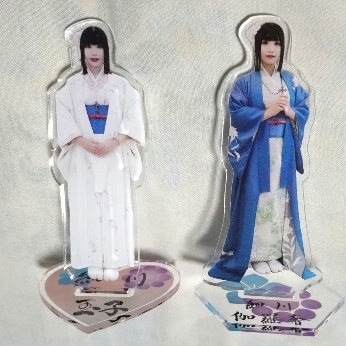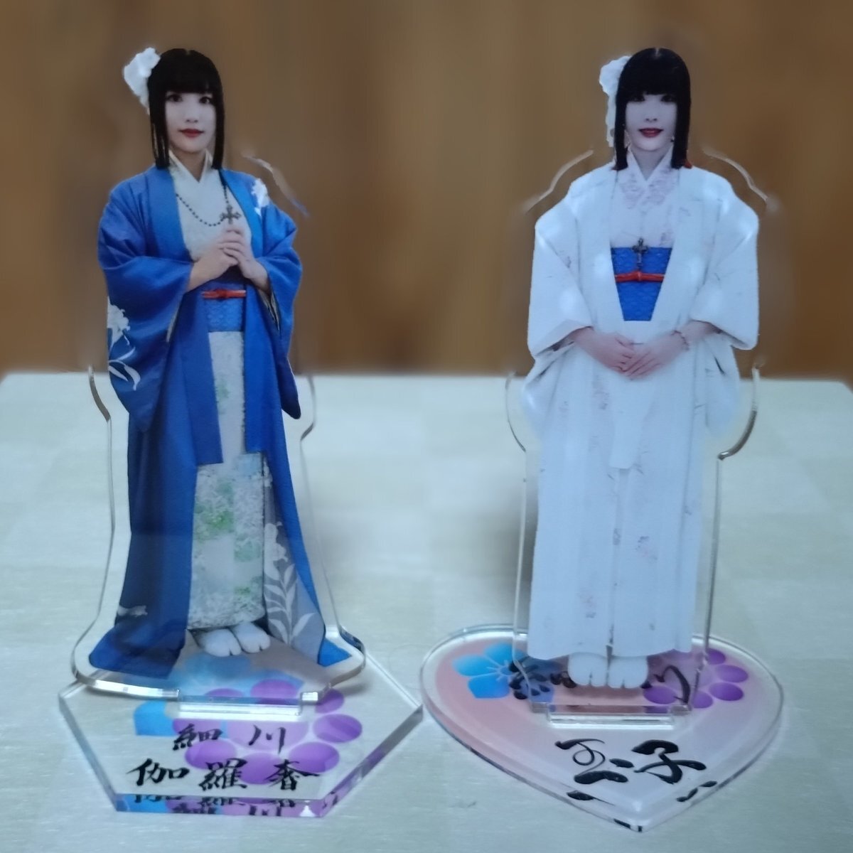 #サムライニンジャフェスティバル2025 にて、購入した、#京都·長岡京おもてなし武将隊つつじ の #細川玉子 様の白衣装バージョンのアクスタと、以前に購入した、青衣装バージョンのアクスタを並べて撮ってみました。 pic.x.com/0gZ4pwM4MF