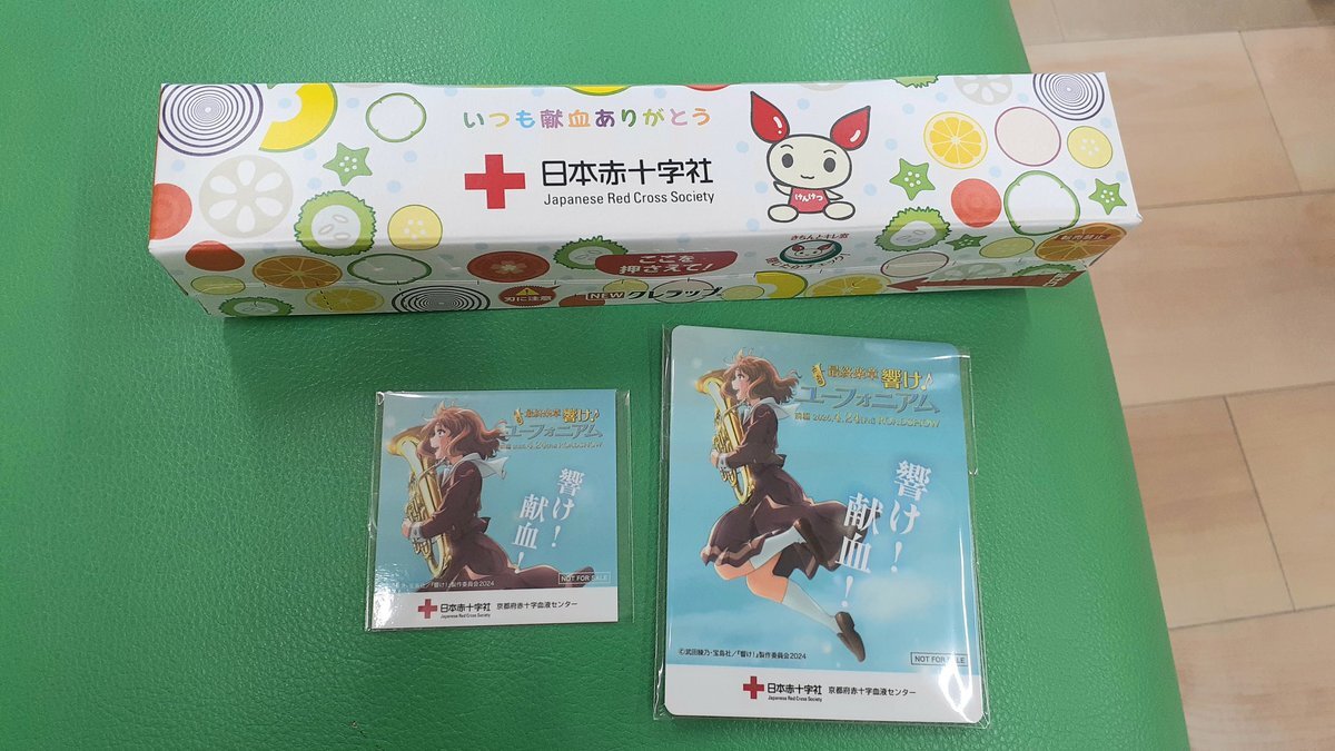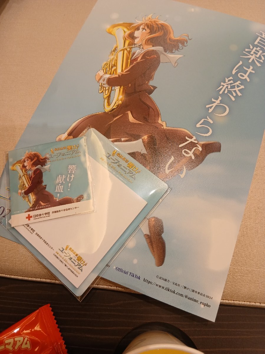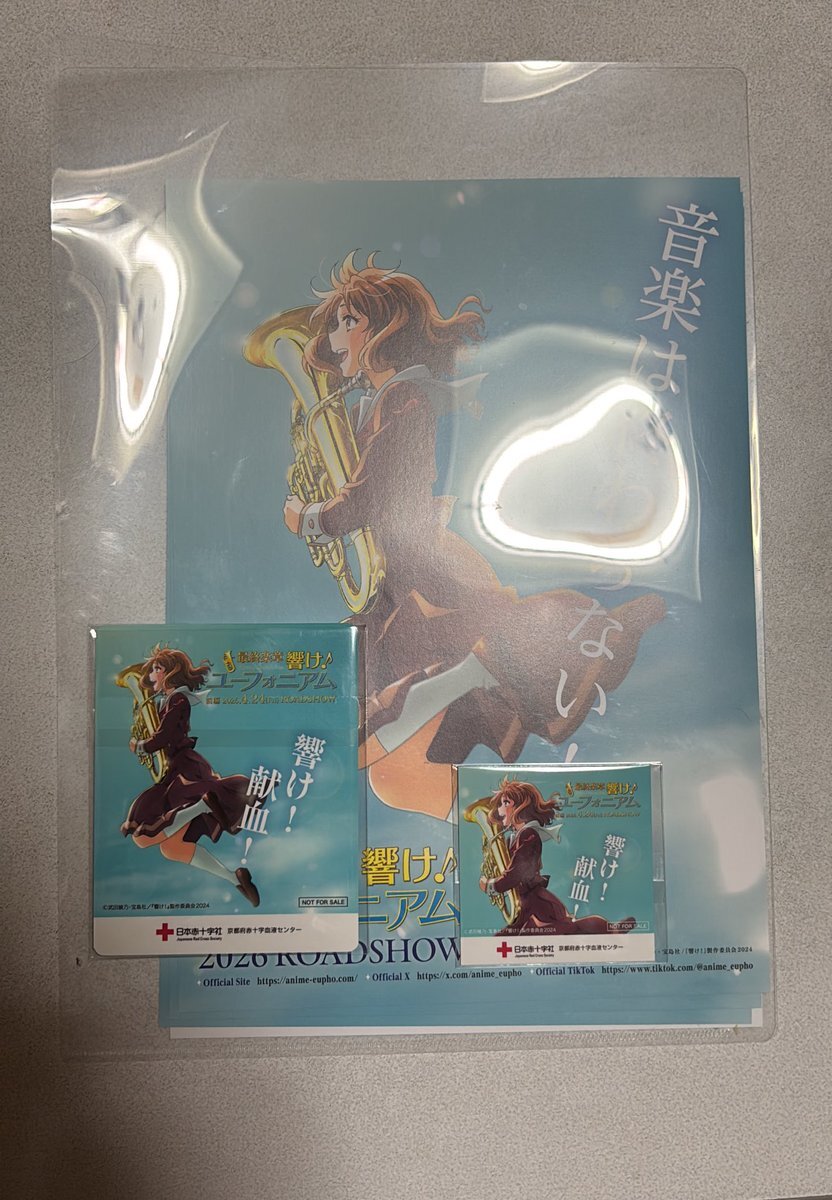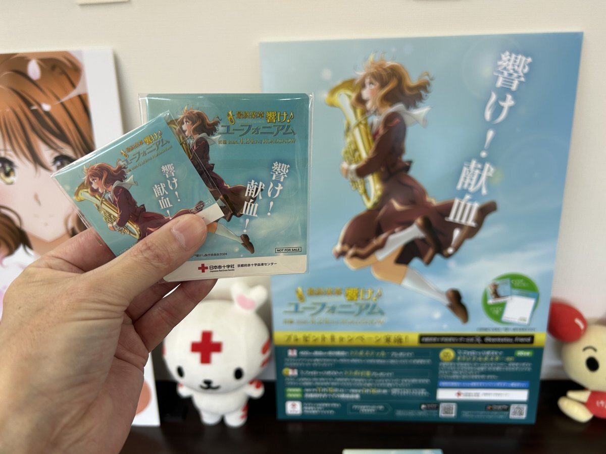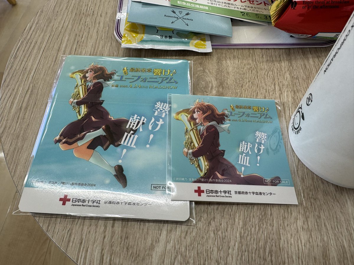 京都着いて朝一で献血してきました(*'▽'*) ユーフォニアム コラボのノベルティいただきました ありがとうございます🎺 #京都献血 #ユーフォ最終楽章 pic.x.com/B9bsx4WdHv x.com/kenketsu_frien…