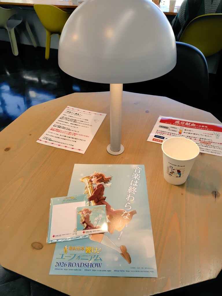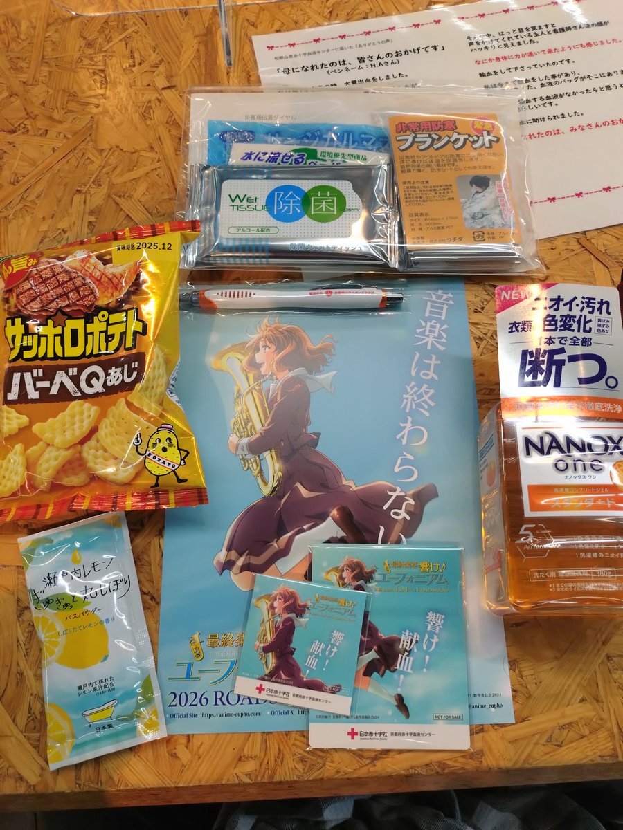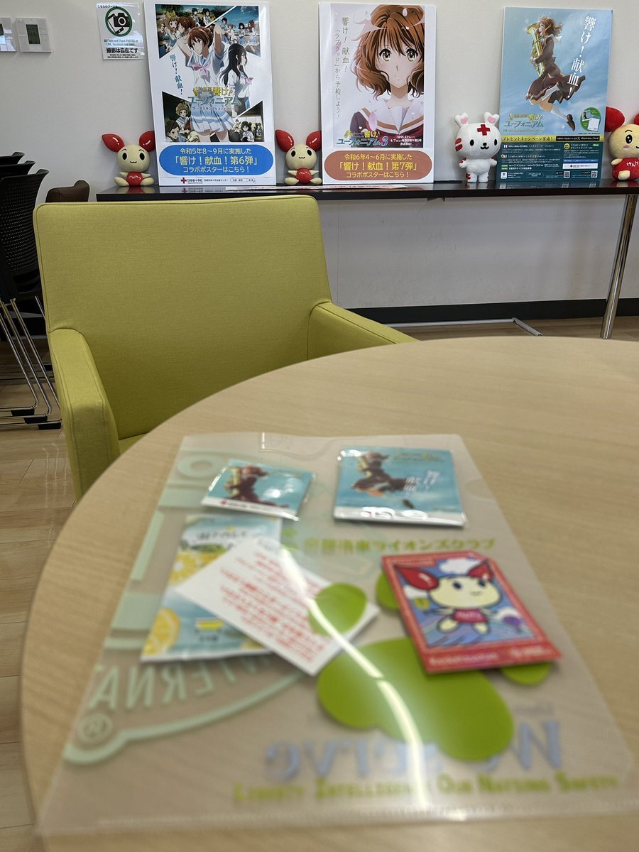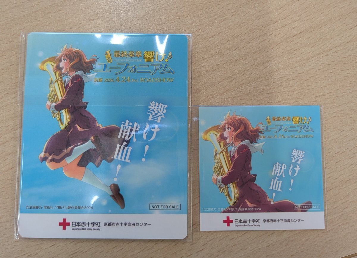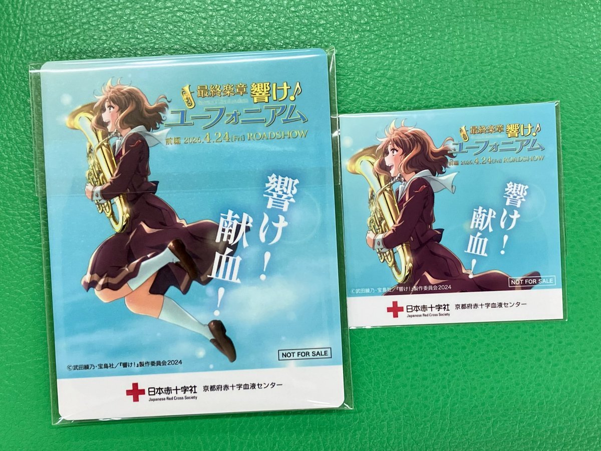 京都着いて朝一で献血してきました(*'▽'*) ユーフォニアム コラボのノベルティいただきました ありがとうございます🎺 #京都献血 #ユーフォ最終楽章 pic.x.com/B9bsx4WdHv x.com/kenketsu_frien…