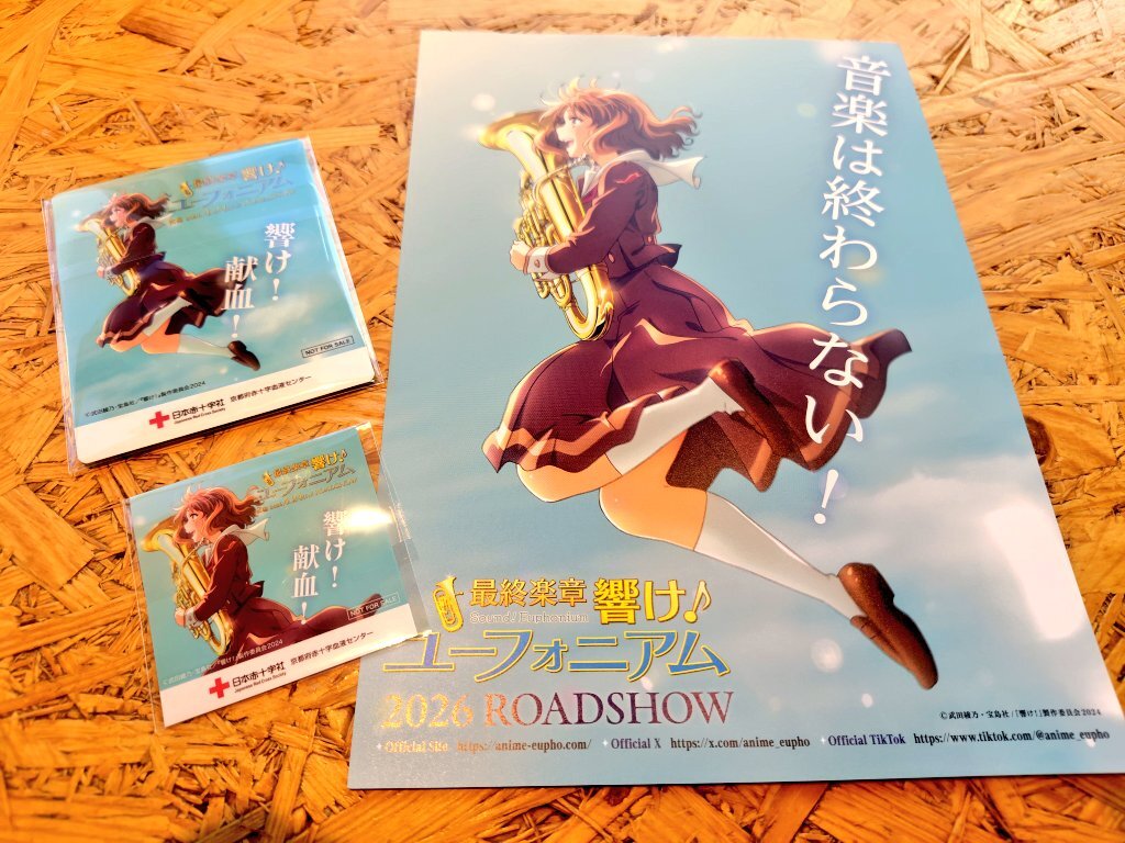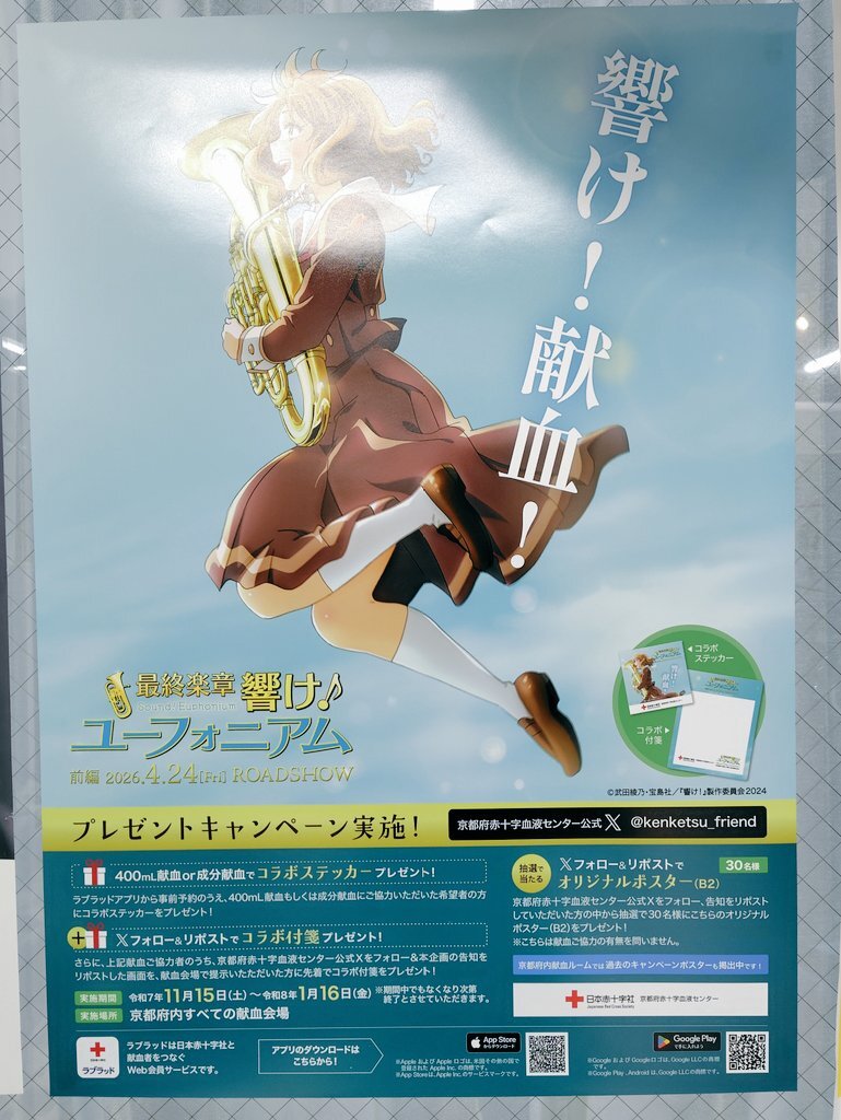 \響け!献血!第8弾 / 献血にご協力いただいた方に先着でコラボグッズをプレゼント! また、当アカウントをフォロー&本投稿をRPでオリジナルポスターが当たるSNSキャンペーンも実施いたします! 🎺詳細は画像をご確認ください🎺 #京都献血 #ユーフォ最終楽章 2026年4月24日(金)全国ROADSHOW