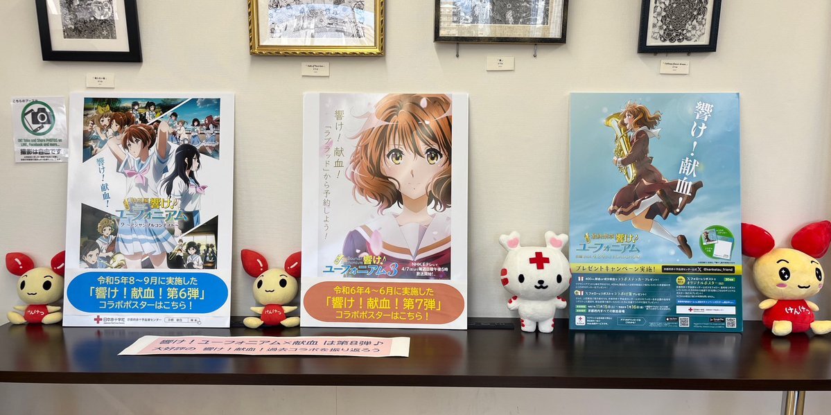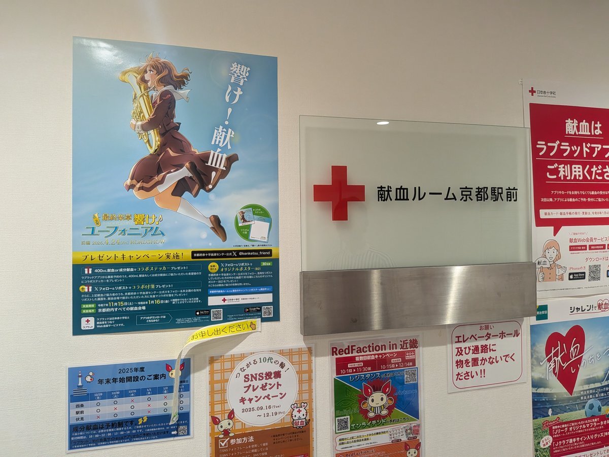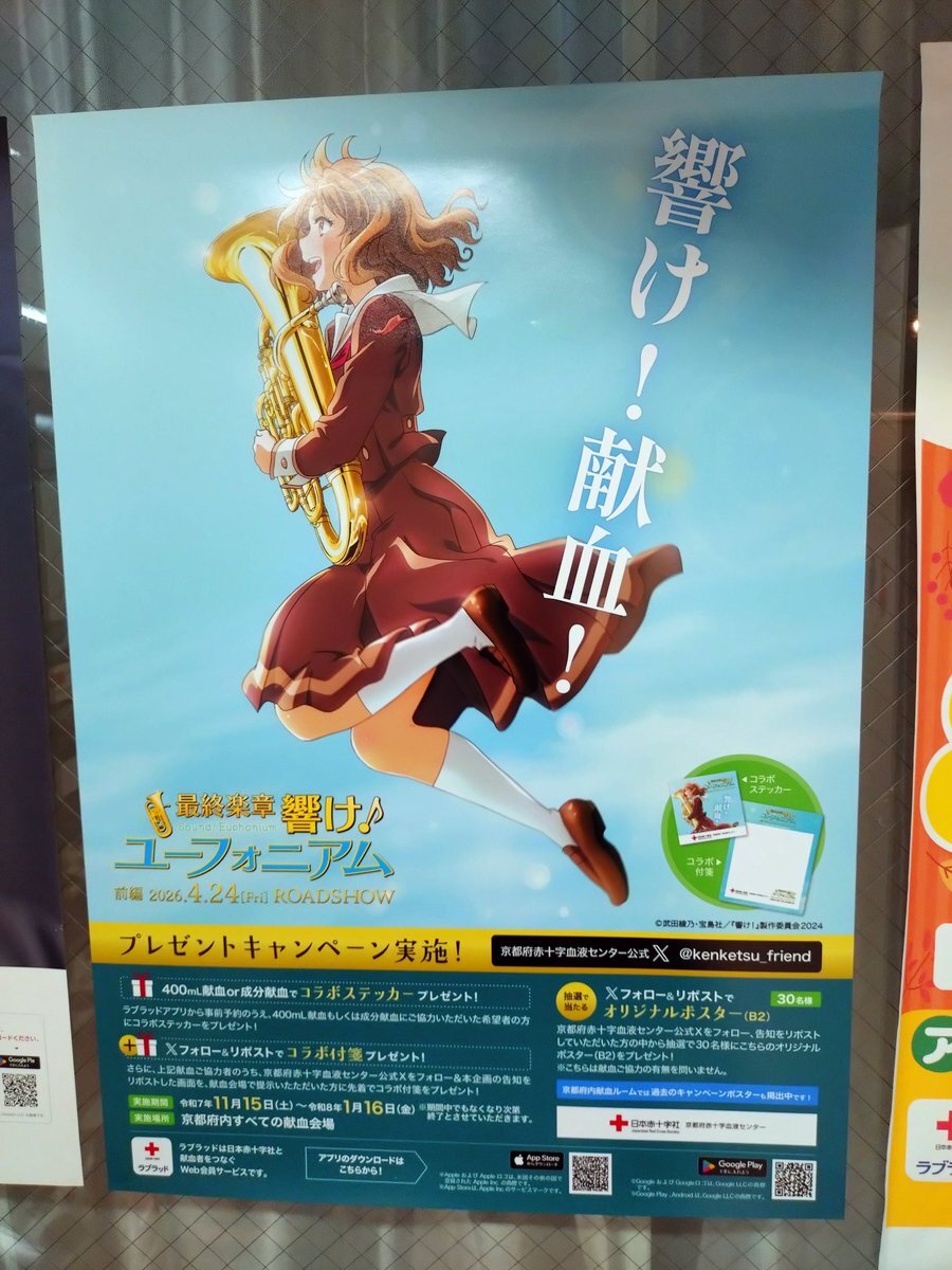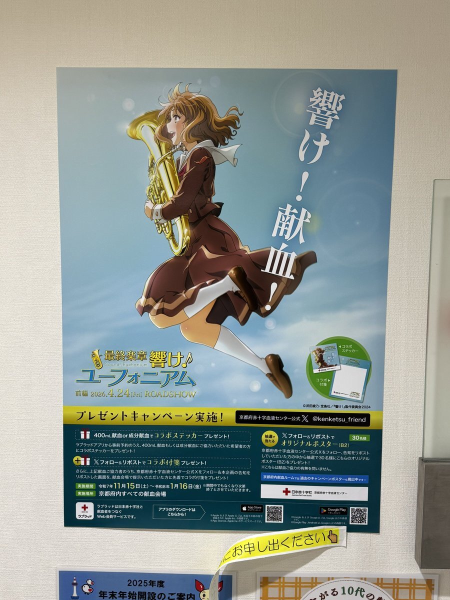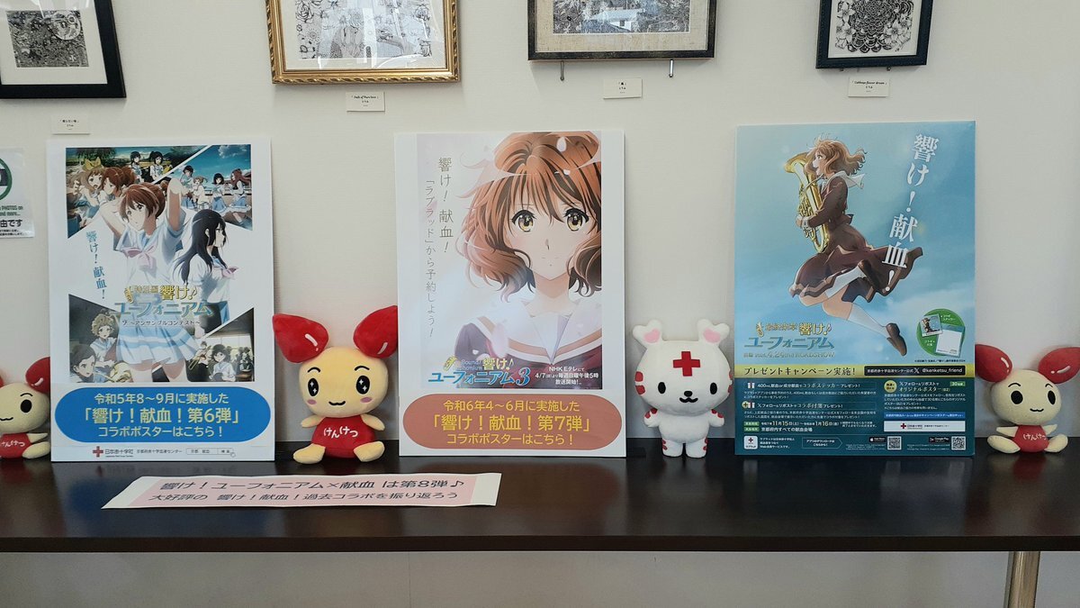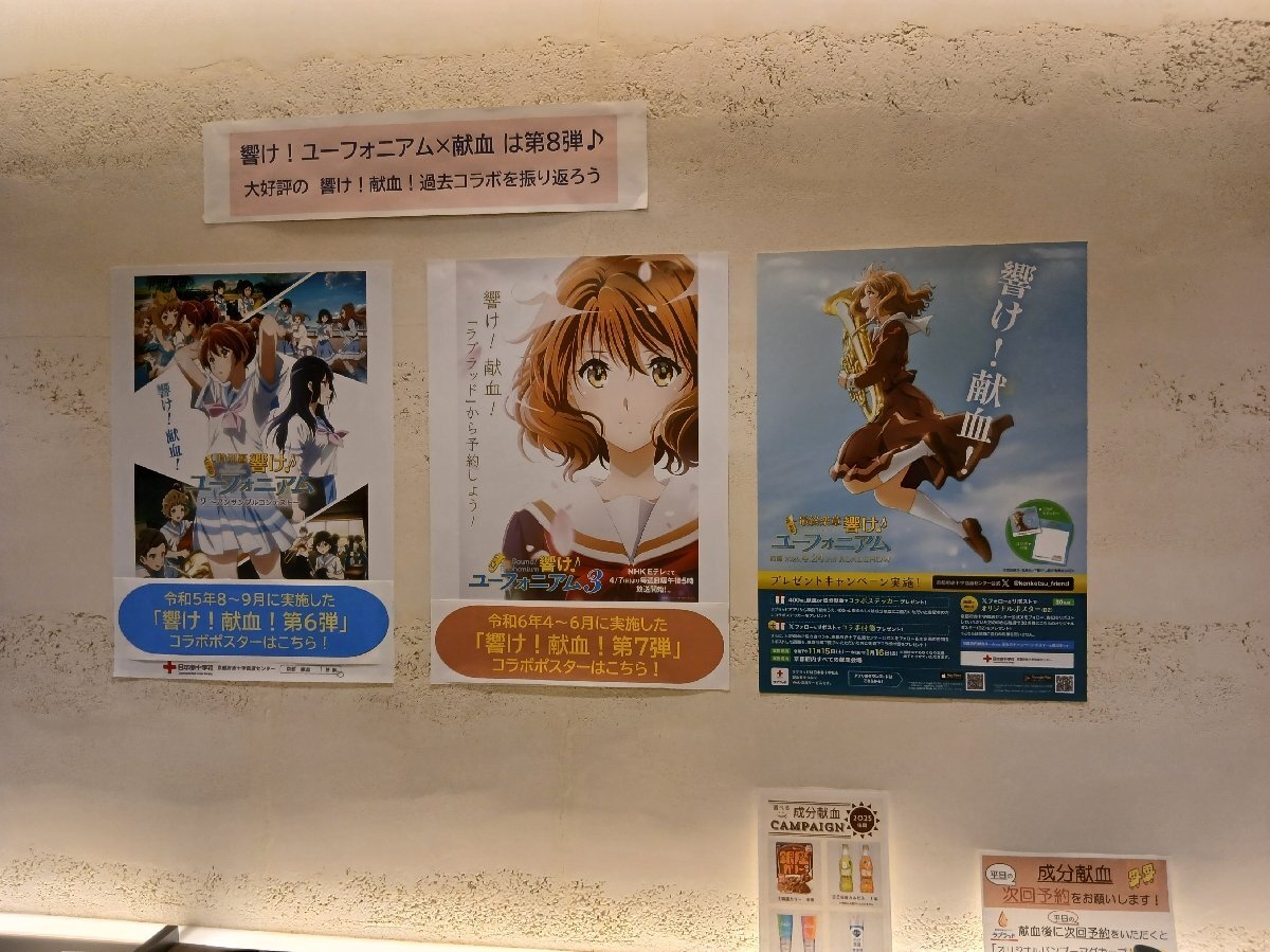 献血ルーム京都駅前の待合室 3回分のユーフォコラボポスター #京都献血 #ユーフォ最終楽章 pic.x.com/x1qAxRvhFT x.com/kenketsu_frien…