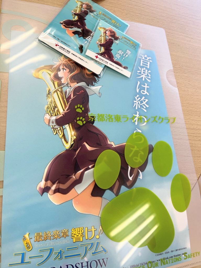 チラシ、お一人様一枚 ということで頂いたんだけど折れちゃうからコンビニでクリアファイル買わなきゃ って思ってたら、洛東ライオンズクラブ さんからいただきました。 #ユーフォ最終楽章 #京都献血 #anime_eupho pic.x.com/UH2qGBC4qv
