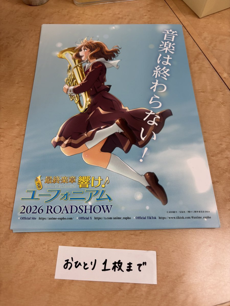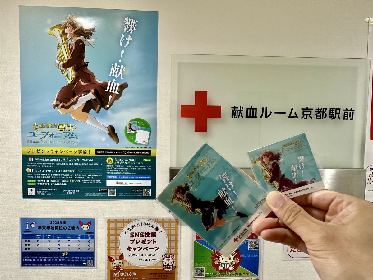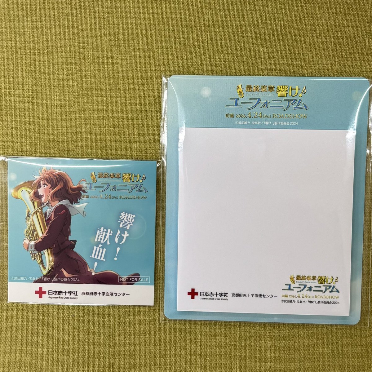 『響け!献血!』 第8️⃣弾! 献血ルーム京都駅前で、協力してきました。 ノベリティのステッカーと付箋に加え、 #ユーフォ最終楽章 のチラシも頂きました😊 コラボポスター3枚も展示されてましたよ✋ ポスター当たるといいな✨ #anime_eupho #京都献血 #ラブラッド pic.x.com/iDWgW5XDSz x.com/kenketsu_frien…