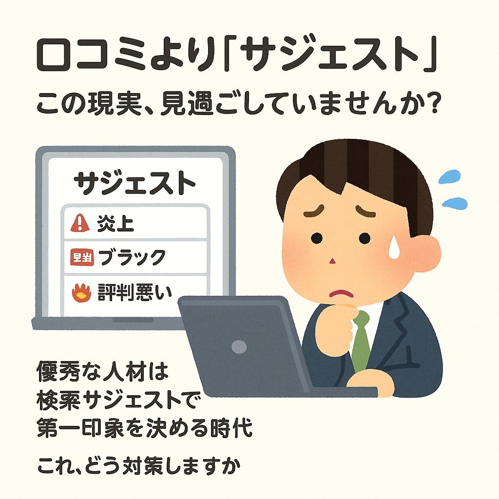 「口コミより"サジェスト"」この現実、見過ごしていませんか?😨 優秀な人材は企業の「検索サジェスト」で第一印象を決める時代。ネガティブな候補が並ぶだけで、候補者は去っていく。 これ、どう対策しますか?👇 #採用課題 #検索サジェスト #人材確保 #人材採用 #企業ブランディング pic.x.com/Tt1asajWXE