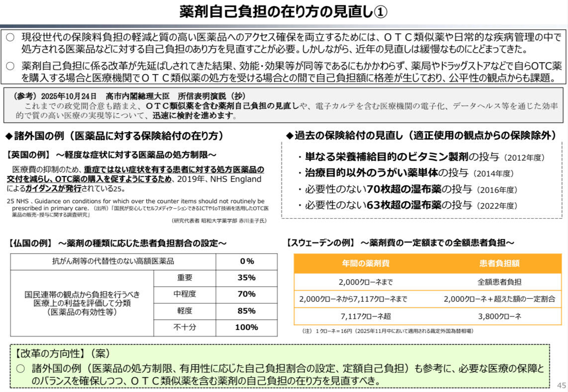 本日開催された財政制度分科会での財務省提出資料中で「諸外国の例(医薬品の処方制限、有用性に応じた自己負担割合の設定、定額自己負担)も参考に、必要な医療の保障とのバランスを確保しつつ、OTC類似薬を含む薬剤の自己負担の在り方を見直すべき」とされ、英仏とスウェーデンが例示されています。