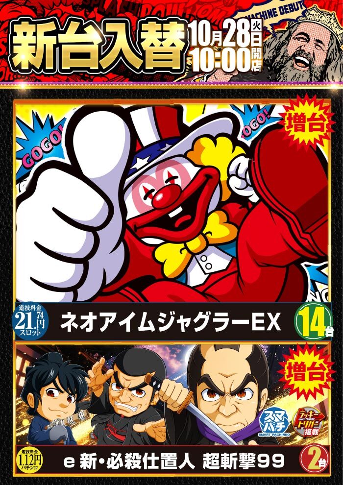 10月28日【火】☀️朝10時開店☀️ 10月はトコトンッ!!《🔥積極🔥》 ”不動の人気機種”を増台🆙🆙 浜キン🆕💫#新台入替 予定💫🆕 #滋賀 #長浜 #キング観光 #ネオアイムジャグラー #最新機種&#人気機種 は 長浜のキングで楽しんじゃって❤️ ㊙️最新情報㊙️はコチラ⬇️ kingkanko-shiga.com/nagahama/ pic.x.com/83KW0Ucau9
