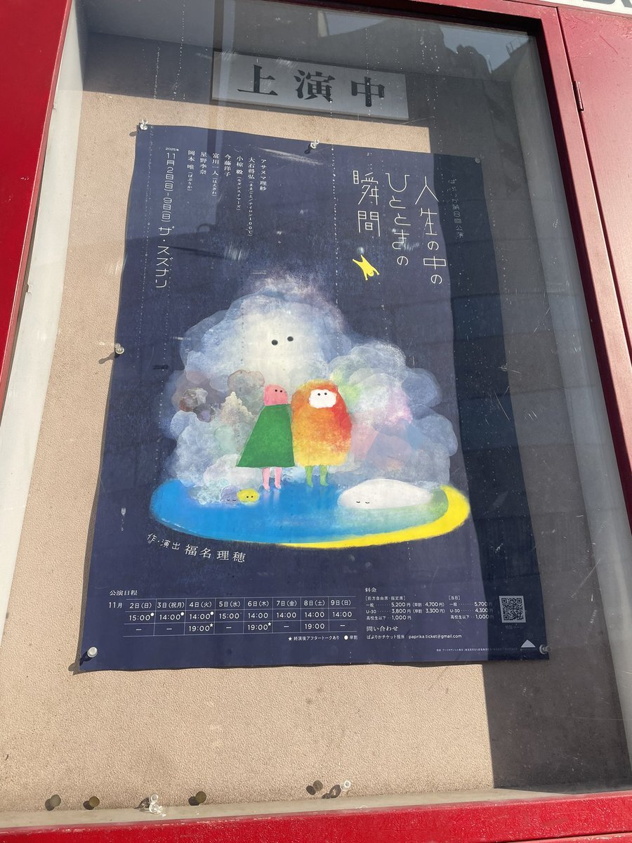 『#人生の中のひとときの瞬間』を観劇。 普遍的なテーマを舞台装置、演出、演技を工夫して、ステキな群像劇に。面白かった。 途中、台本にしっかりとセリフとして書かれていただろうシーンがドキュメントのように見え、トリハダ。勉強になった。 明日11/9(日)観れます! 是非! 下北沢ザ・スズナリ x.com/pap926/status/…