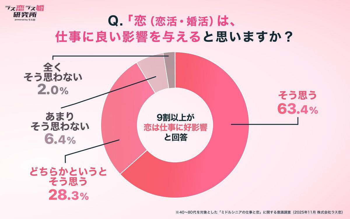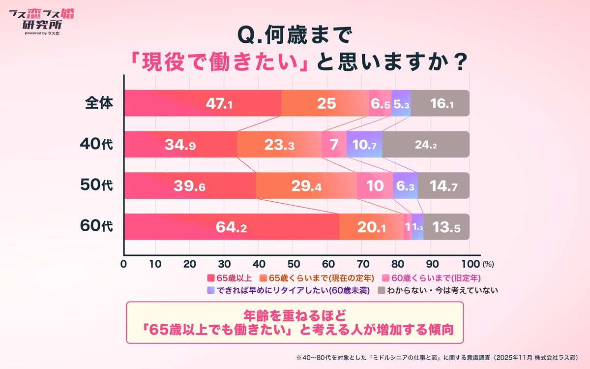 / ラス恋・ラス婚研究所🧪💕 #人生100年時代の日 1,280名調査📋️📊 \ 「中高年の仕事と恋」について大調査! ・9割が恋は仕事に好影響 ・恋する大人世代は65歳以上も働きたい ・年齢を重ねるほど就労意欲UP? ・72%が恋活で支出UPと回答! pic.x.com/vOiSOuWvDG