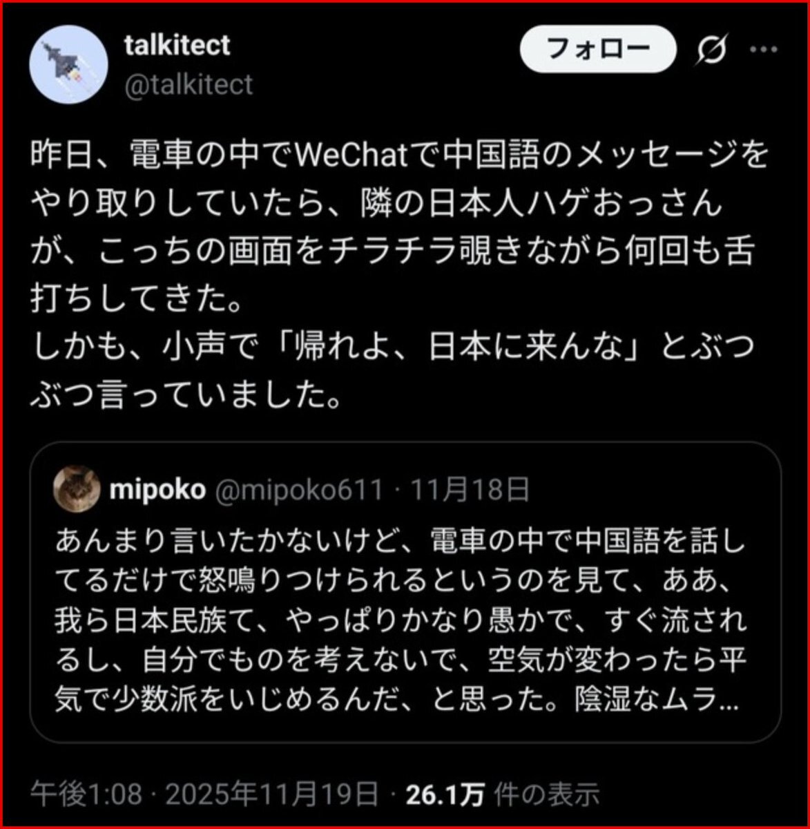 昨日、電車の中でWeChatで中国語のメッセージをやり取りしていたら、隣の日本人ハゲおっさんが、こっちの画面をチラチラ覗きながら何回も舌打ちしてきた。 しかも、小声で「帰れよ、日本に来んな」とぶつぶつ言っていました。 x.com/mipoko611/stat…