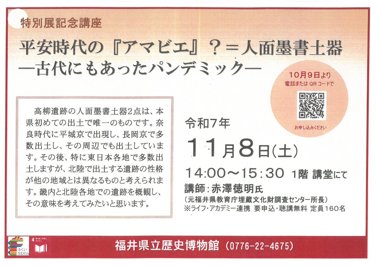わん(明日11/8(土)14時から、記念講座「平安時代の『アマビエ』?=人面墨書土器」を開催。#越前 で見つかった #人面墨書土器#コロナ 禍で話題となった #アマビエ !? そして #渤海使 との関わりも明らかになる…!? #参加無料 なのでぜひ! #福井県立歴史博物館 #異国 #特別展 pic.x.com/e76YtIsQyZ