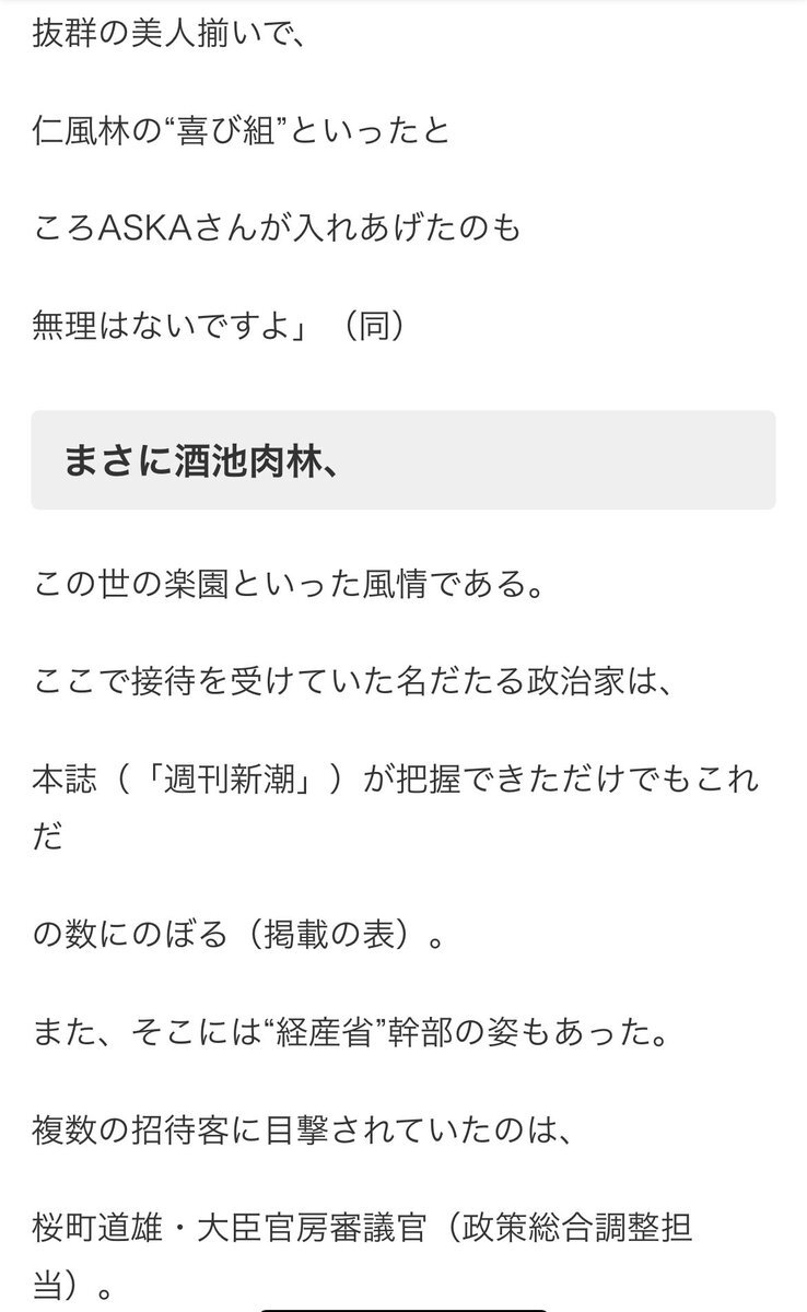仁風林が懐かしくてトムさん(@SeriousTom1)のツイートを引用。ASKAの女、栩内香澄美に手を出した小野寺五典。この図には竹中平蔵もいるからね。 #こんなネットウヨは嫌だ #小野寺五典 #仁風林 #ASKA #栩内香澄美 #竹中平蔵 x.com/SeriousTom1/st…