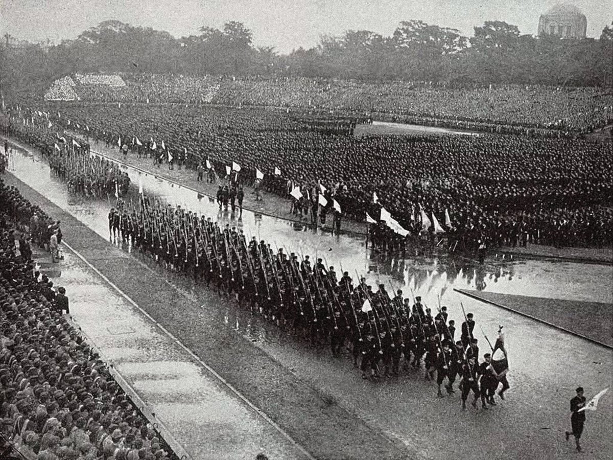 82年前の今日。1943年10月21日、戦局が悪化する中、東京で学徒出陣壮行会が行われました。理工系・教員養成系以外の学生の徴兵猶予が停止され、いわゆる学徒出陣が始まったのです。東京帝大建築学科卒の小林政一の設計になる明治神宮外苑競技場を会場に、雨の中2万5千人が行進しました。 #今日は何の日
