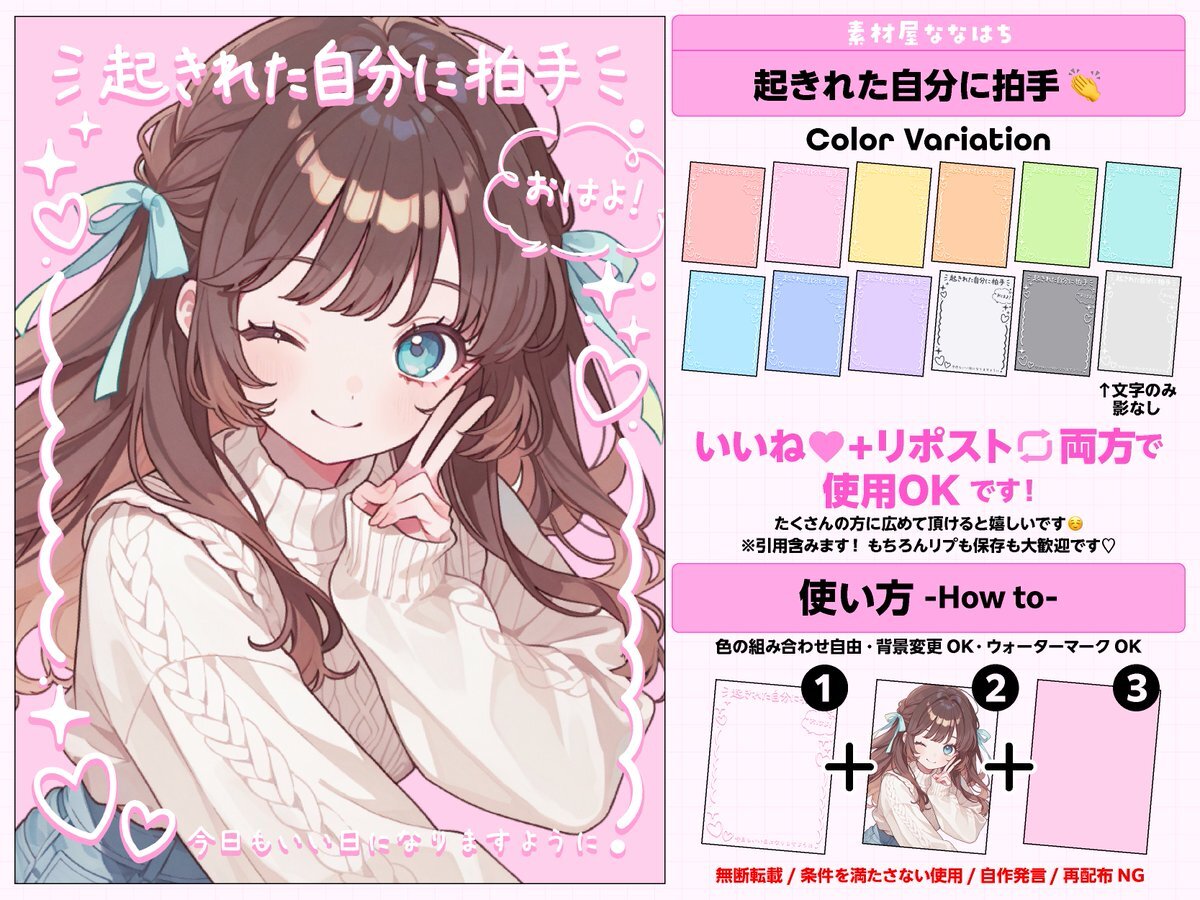 👏起きれた自分に拍手👏 手書き風の使いやすい素材です🩷 ⚠️いいね🩷とリポスト🔄で使用OK❣️ カラバリ11色✧︎*。 ツリーにつなげます🐝⋆゜ #VTuber素材 #素材屋ななはち #おはようVTuber素材