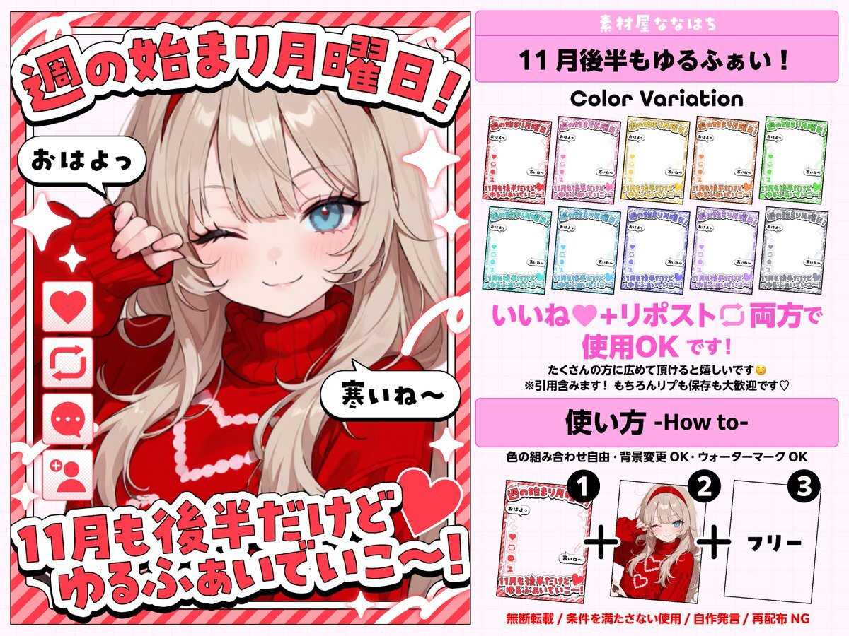 月曜日に使える❤️11月後半もゆるふぁい❤️ ⚠️いいね🩷とリポスト🔄で使用OK❣️ カラバリ10色✧︎*。 ツリーにつなげます🐝⋆゜ #VTuber素材 #素材屋ななはち #おはようVTuber素材