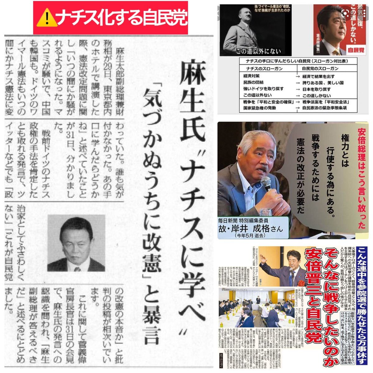 麻生太郎氏はナチスに学び気づかぬ内に改憲すればいいと言っていた ナチス扱いすなと言われても、事実、自民党の根本には麻生氏の考えがあるのだから仕方ない #自民党政治を終わらせよう #改憲発議絶対させるな #今を戦前にしない pic.x.com/0O2RqnRZe8 x.com/cargojp/status…
