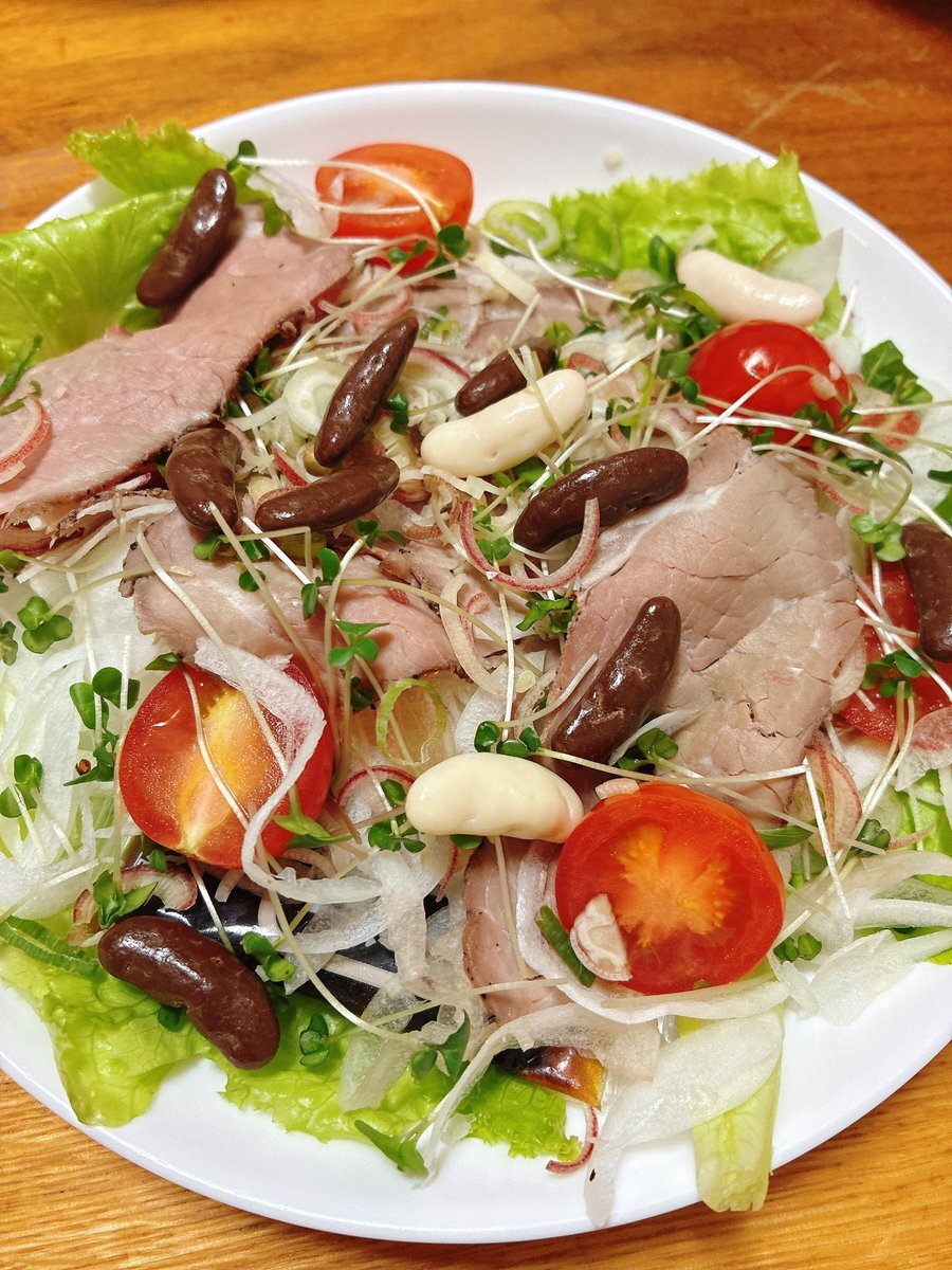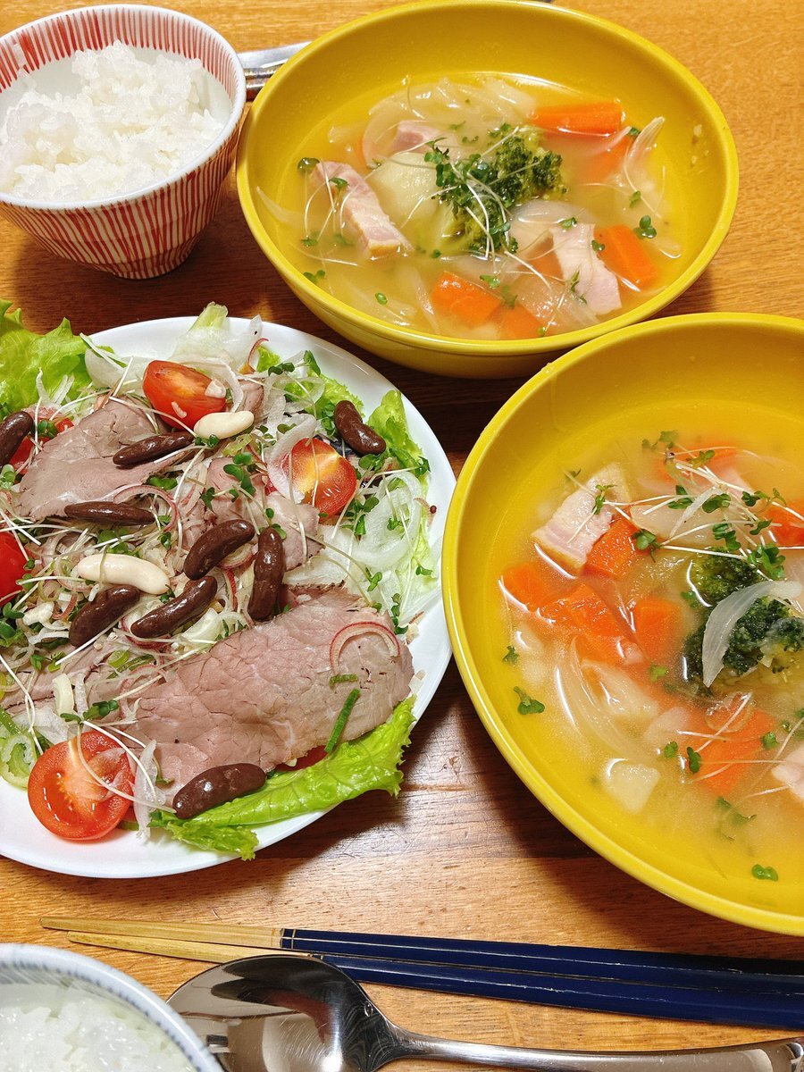 今夜は #ポトフ #ローストビーフサラダ これは惣菜です。 サラダにチョコ柿の種トッピングしました。 #男の料理 #今日のおうちごはん pic.x.com/hBhGxsitFK