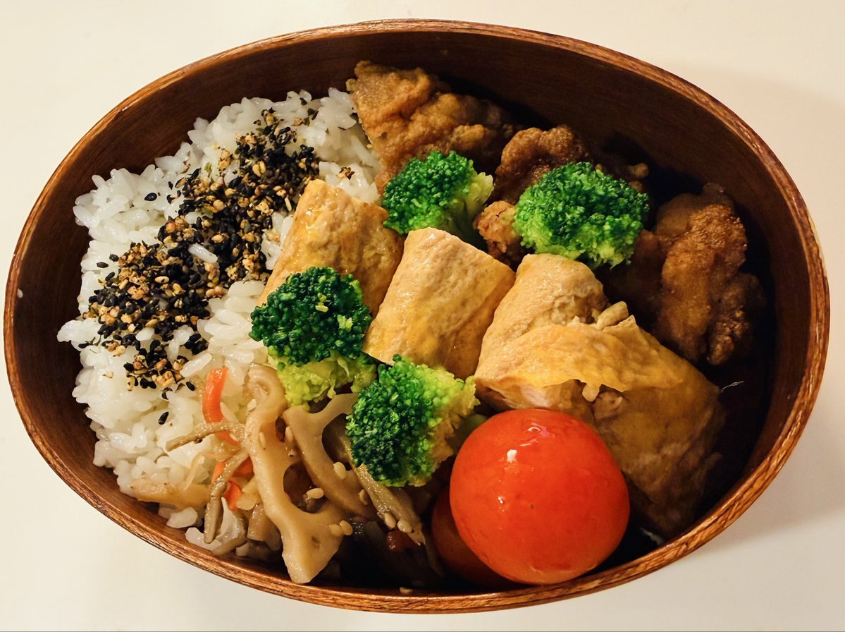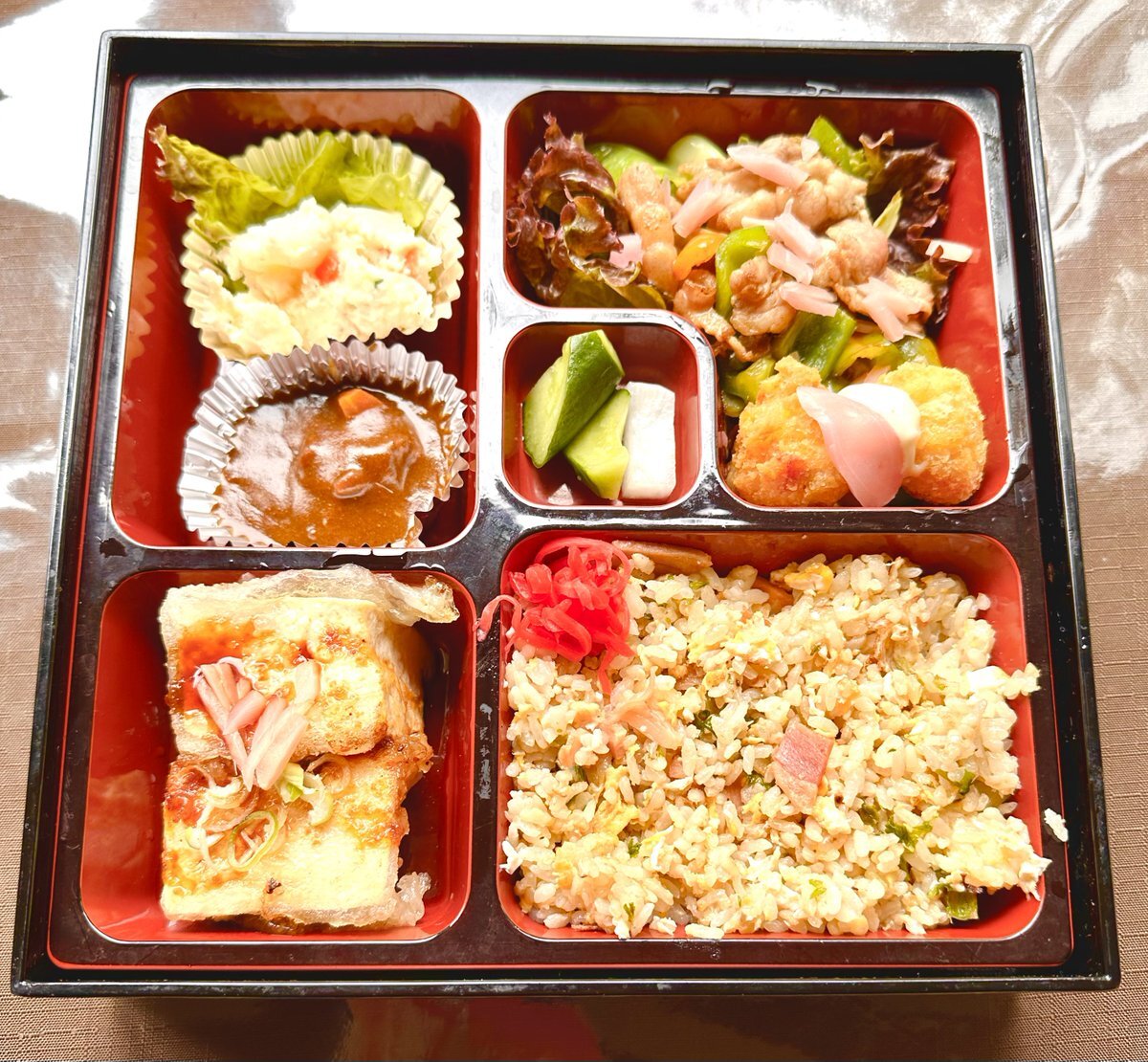 今日のお弁当 *レタスとベーコンの炒飯 *豚肉とピーマン、岩下の新生姜炒め *揚げ豆腐 *岩下の新生姜ポップコーンチキン *ポテトサラダ、ひとくちカレー #今日のお弁当 #岩下の新生姜レシピ pic.x.com/UH5AgYw2JM
