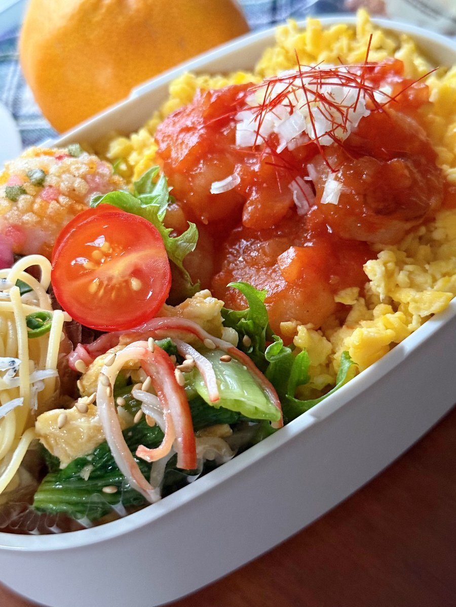 2025/11/13 #今日のお弁当 #エビチリ弁当 作り置きを使って30分弁当♪ もう朝起きれない🫠 @kara_bee_000 karaさんに教えてもらった 青梗菜ナムルも作ってみたよ🤗 ニンニク入れたから、次男がめちゃくちゃ喜んで食べた😋ありがとう💕💕 #お弁当 #お弁当記録 pic.x.com/DIORbbcGM9
