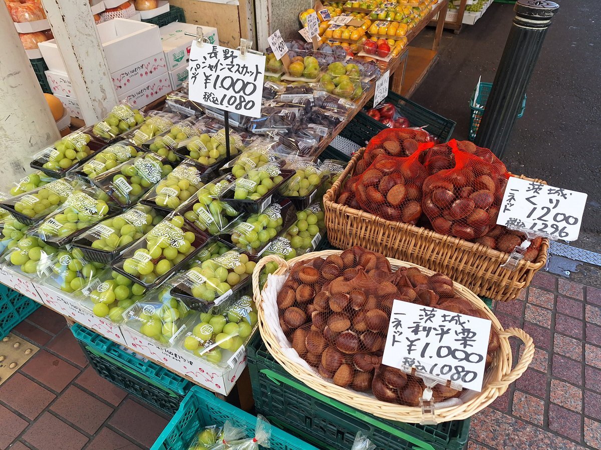 9月28日(日) こんにちは #仙台 は晴れで12時10分までの最高気温は11時47分観測の25.3℃ #今日の仙台 はまだ暑いけど… #一番町アーケード街#いたがき さんで秋の味覚🍇🌰 #一番町四丁目商店街 あと半日よろしくお願いします pic.x.com/8U7KJ8K1En