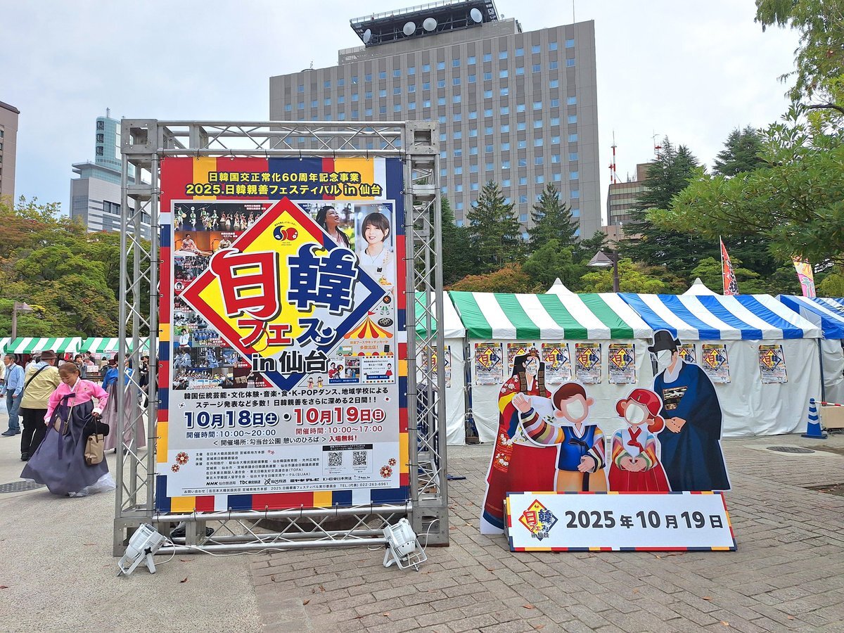 10月19日(日) こんにちは #仙台 はくもりで12時までの最高気温は深夜0時24分観測の19.8℃で、正午前は15℃台で推移してて肌寒 #今日の仙台 は🇰🇷 #日韓フェスin仙台 にやって来ましたぁ~ #いんくん ( #尹くん ) #マッコリ #勾当台公園いこいのゾーン (県庁前) あと半日よろしくお願いします pic.x.com/qxJmQUvHsC