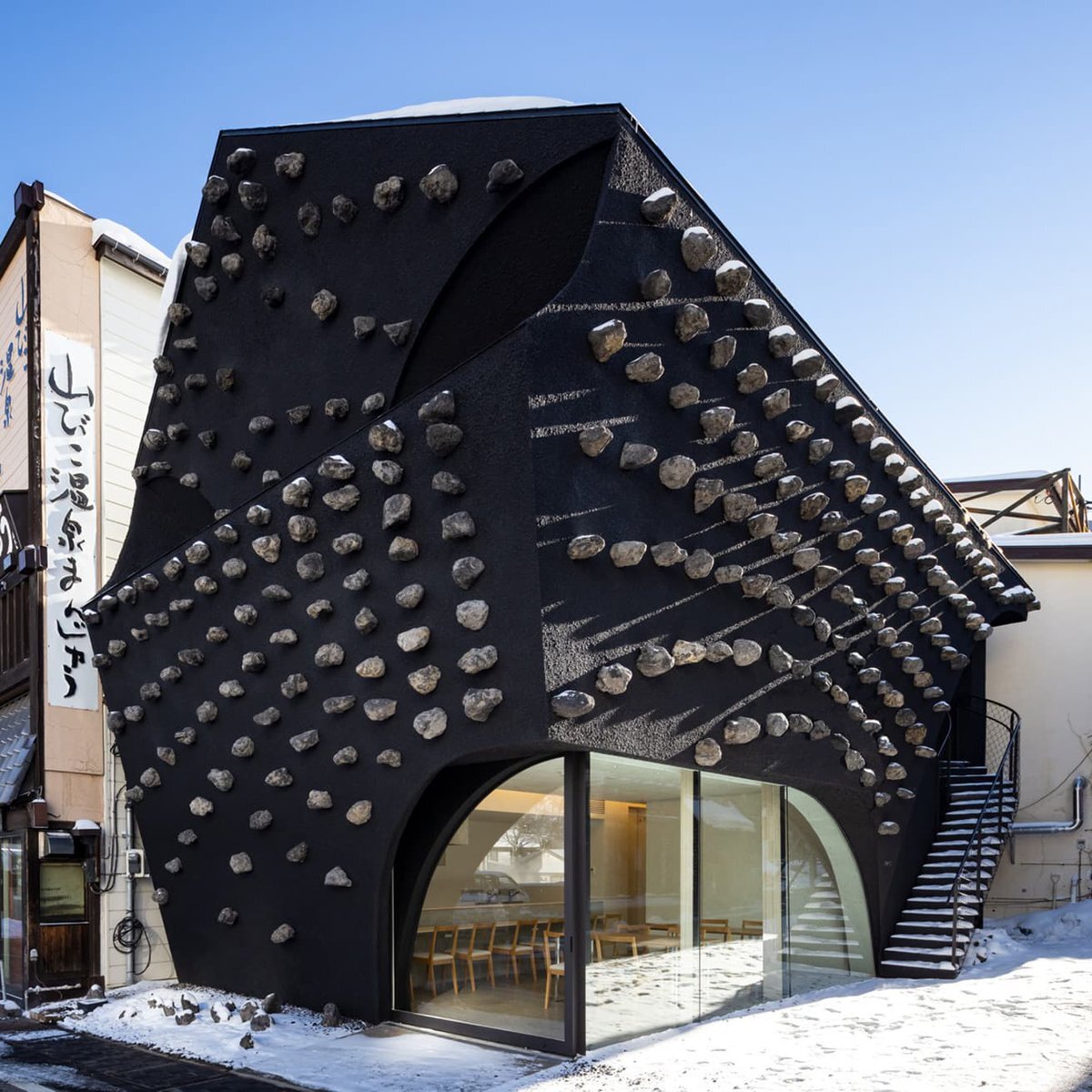 【 #今日の名建築 】隈研吾の設計による温泉宿〈草津温泉きむらや〉。湯畑に自然に転がっている浅間石を、湯気を思わせるカーブを描きながら外壁に配しています。 ⇒ ow.ly/96ZY50XoP6w pic.x.com/pGYOHWCUf4