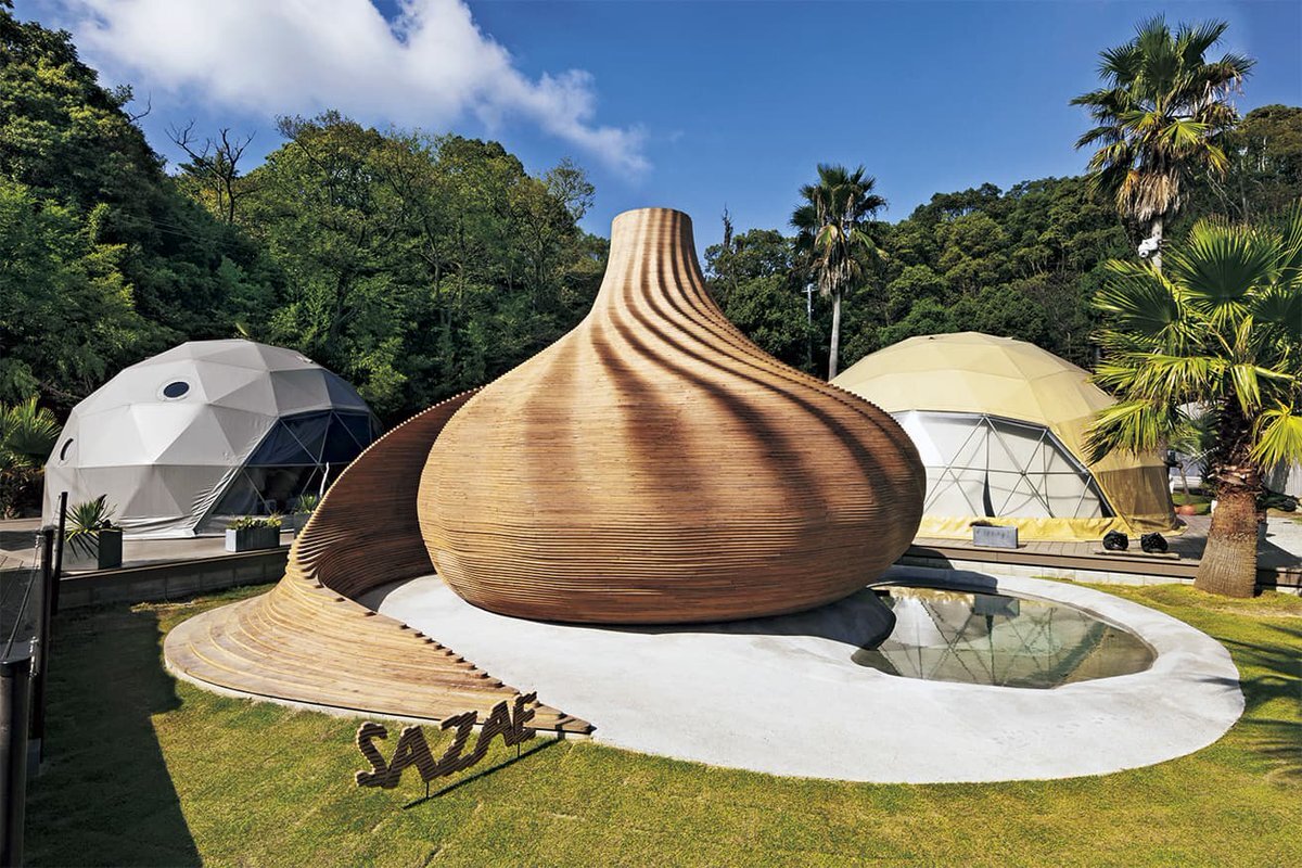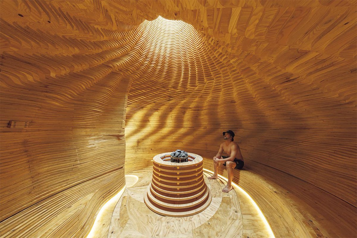 【 #今日の名建築 】隈太一が設計した、曲線的な構造が目を惹くサウナ〈SAZAE〉。1000枚以上の合板の積み重ねによるヒダのような形状はサウナ内の光に陰影を生みだし、曲線的な構造は座った際に体にうまくフィットするように設計されています。 ⇒casabrutus.com/categories/arc… pic.x.com/gClP4f77n7