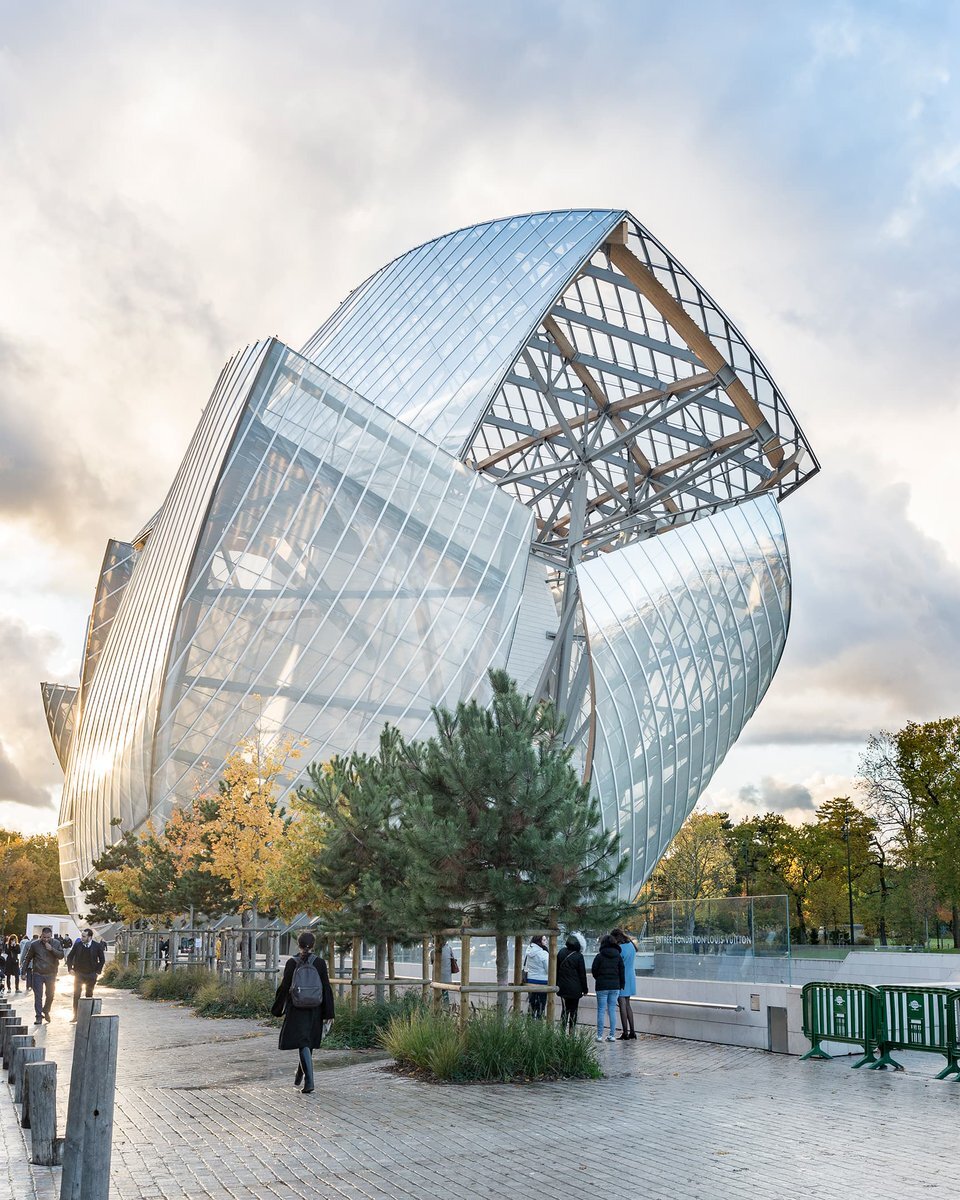【 #今日の名建築 】2014年開館、フランク・ゲーリー設計〈フォンダシオン・ルイ・ヴィトン〉。風をはらんだ12枚の帆のような乳白色のガラスパネルが建物を覆っています。 ⇒casabrutus.com/data/architect… pic.x.com/75V6I2Waes
