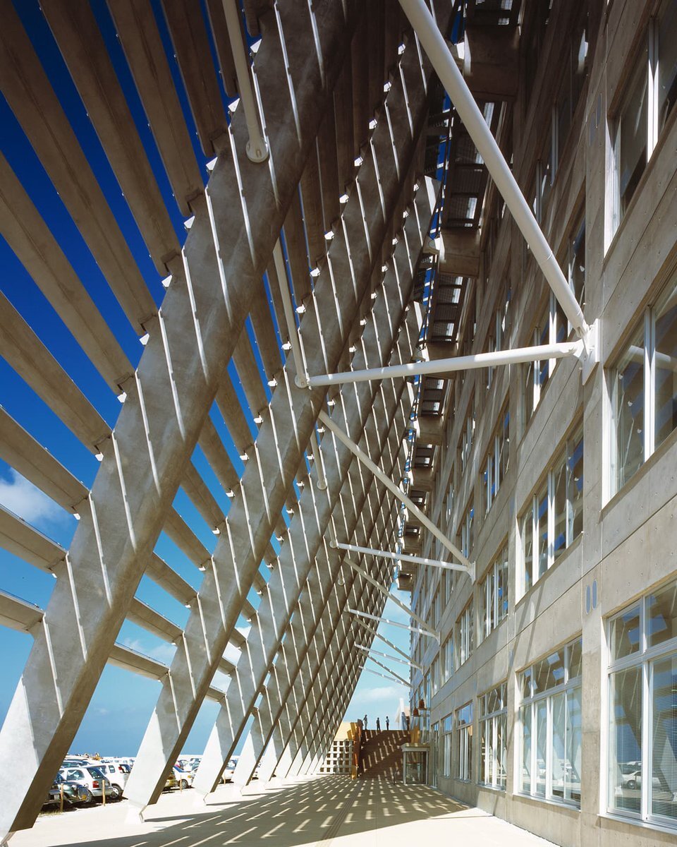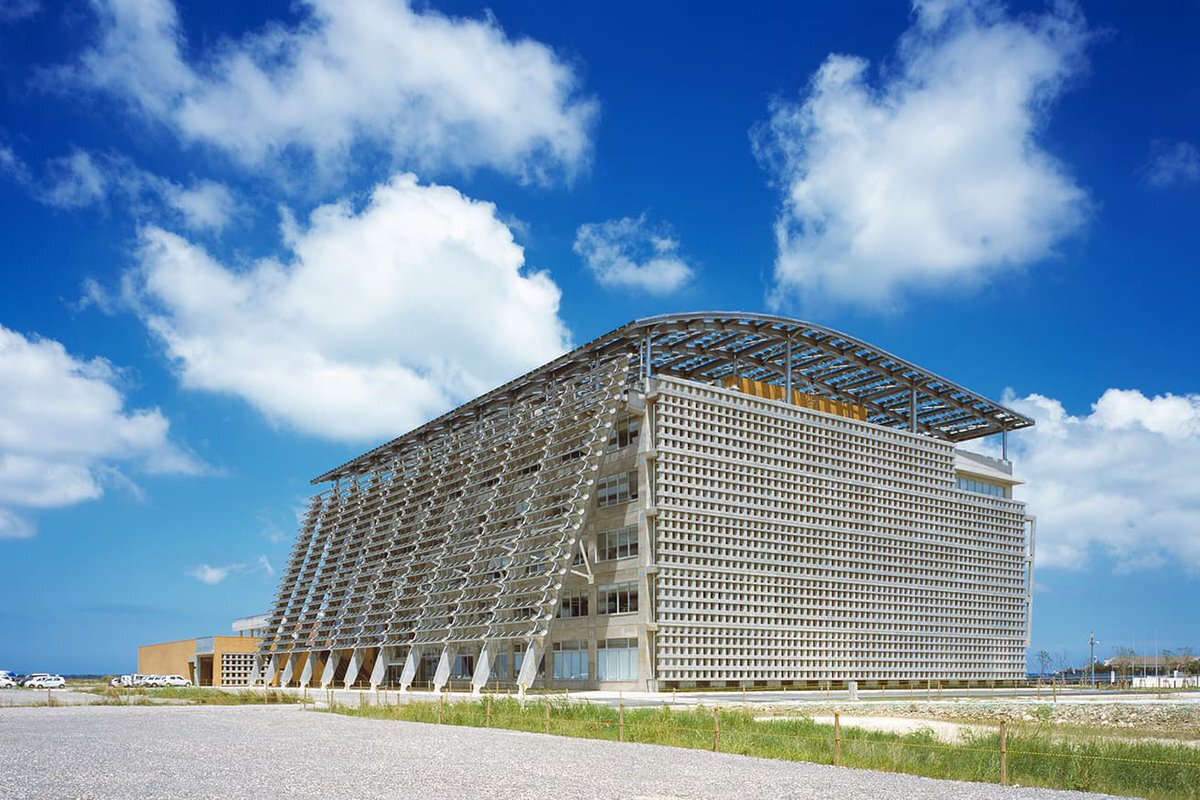 【 #今日の名建築 】2002年竣工、日本設計が手がけた〈糸満市役所〉。連続する水平の斜めに配置されたルーバーは、沖縄の民家に見られる伝統的な建築様式である“アマハジ(雨端、軒下のこと)”をモチーフにしたものです。 ⇒casabrutus.com/categories/arc… pic.x.com/PvAfuuRyHL