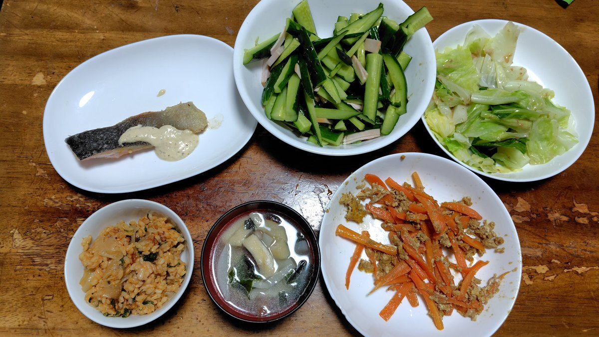 #今日の夕ごはん 11月10日(月) ・鮭のムニエル ・ハムときゅうりのサラダ ・茹でキャベツ ・にんじんしりしり ・炊き込みご飯 ・大根のみそ汁 #todaysdinner #洋風魚料理 #鮭のムニエル #鮭 買い物 千切り大根など pic.x.com/4LMDFk4VsP