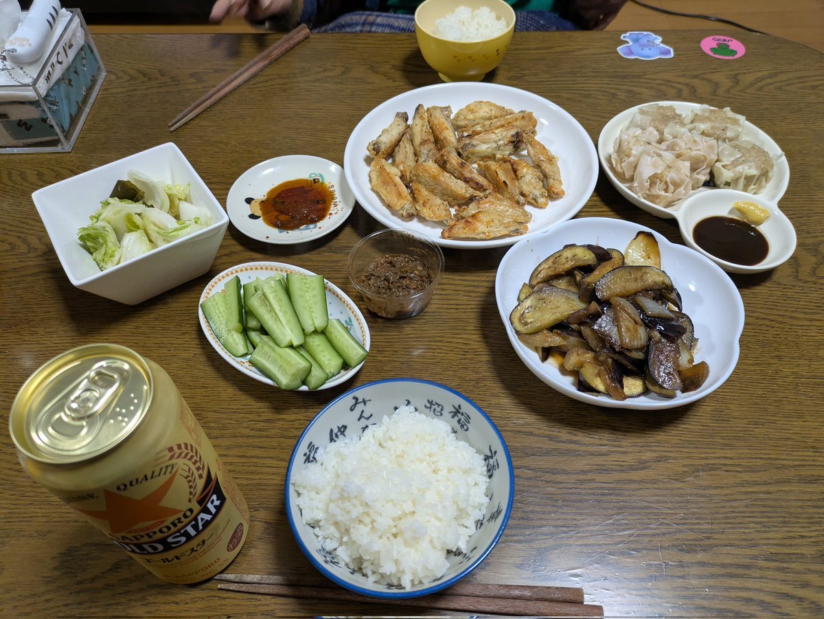 #今日の夕ごはん 妻出かけてなので私の当番 鶏手羽中グリルチキン 談合坂SAの焼売,肉と海老 茄子の油生姜味噌 神楽辛子ディップ:胡瓜 第二弾白菜漬け 白米二膳 今日フォロワーさんにばらまいた 白菜漬けを一応食べてみた(・・;) 少し塩っぱいけどご飯泥棒に 出来てた!! 疲れたからご飯が旨い😋👍️ pic.x.com/rufy11Zmi5
