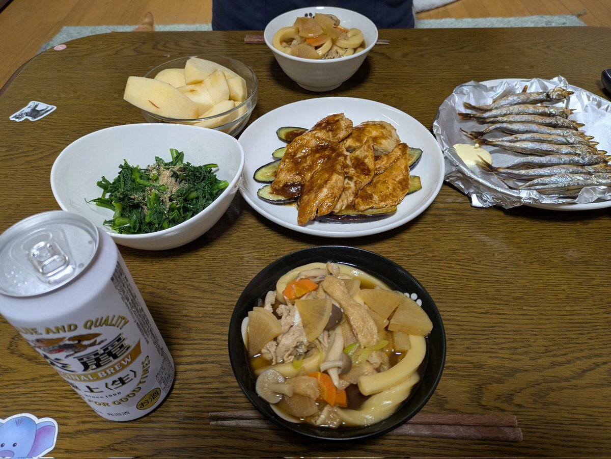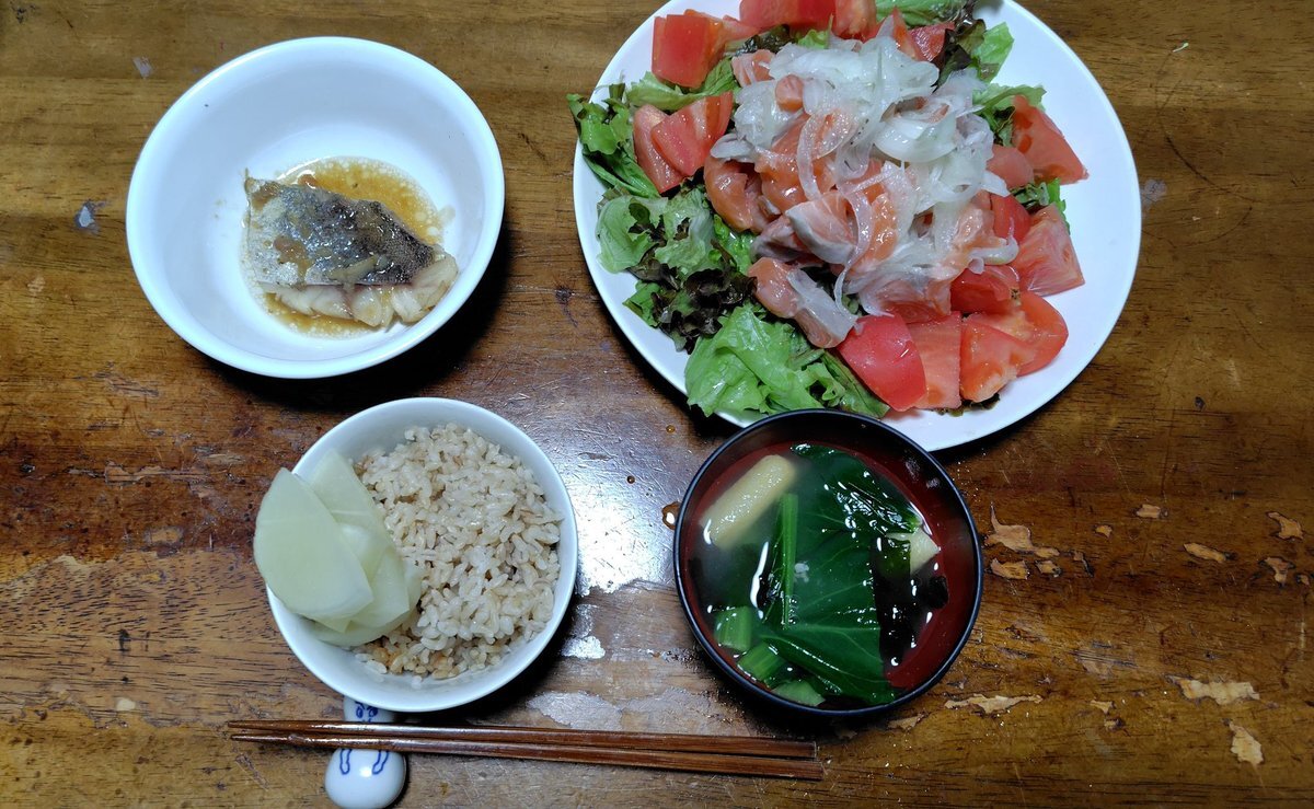 #今日の夕ごはん 11月17日(月) ・鱈の照り焼き ・サーモンサラダ レタス、とまと、たまねぎ ・小松菜のみそ汁 ・大根の漬物 #todaysdinner #焼魚料理 #grilledfish #照り焼き 買い物 ひじき、ちくわなど pic.x.com/H1xtJ1hO2f
