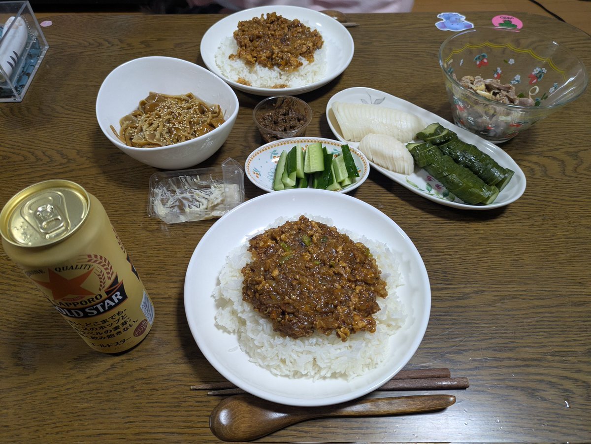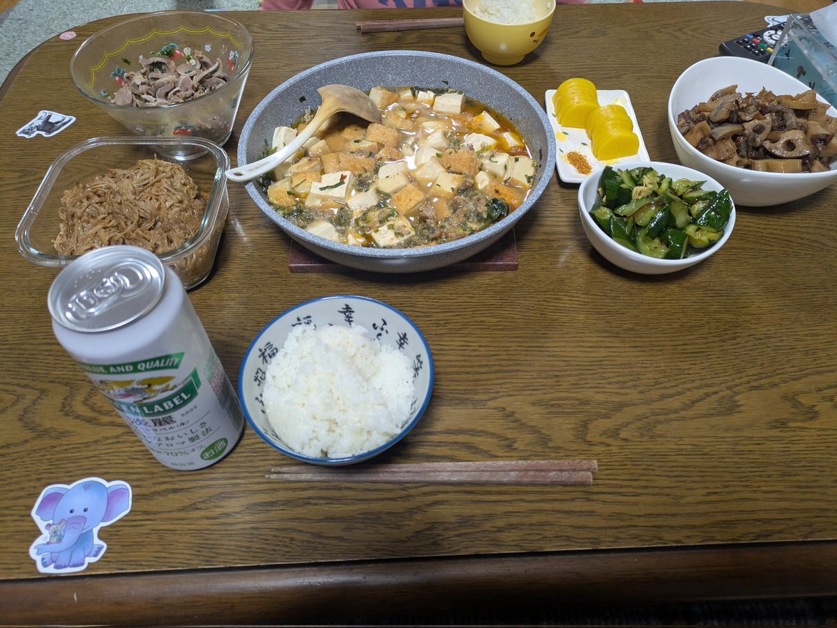 #今日の夕ごはん 私の当番 会議前に作った品 麻婆豆腐厚揚げ入 砂肝味噌和え 蓮根の牛すじ煮 叩ききゅうり 沢庵 常備菜 ピリ辛味噌えのき 2杯目キンミヤお湯割り 8時に会議終わったので のんびり夕ごはん✌️ 蓮根美味しかった😋👍️ pic.x.com/ptzvilxi1X
