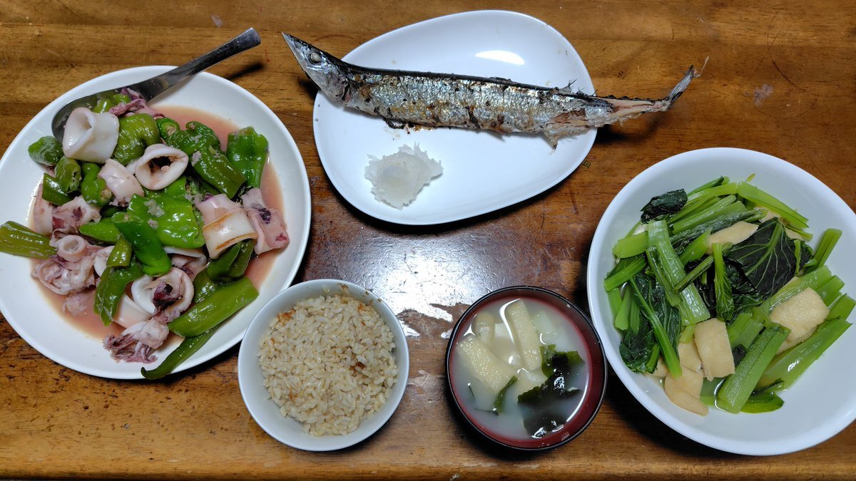 #今日の夕ごはん 11月8日(土) ・さんまの塩焼き ・ヤリイカと伏見唐辛子のガーリックバター炒め ・小松菜のたいたん ・豆腐とねぎのみそ汁 #todaysdinner #焼魚料理 #grilledfish #さんまの塩焼き #pacificsaury pic.x.com/IE6tMDPaUb