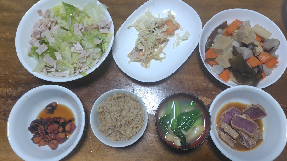 #今日の夕ごはん 11月16日(日) ・鮭のクリーム煮 ・高野豆腐と根菜の煮物 里芋、にんじん ・ハムとキャベツのサラダ(レモンドレッシング) ・まぐろの漬け ・煮たこ ・小松菜のみそ汁 #todaysdinner pic.x.com/aE3Xo9WaFr