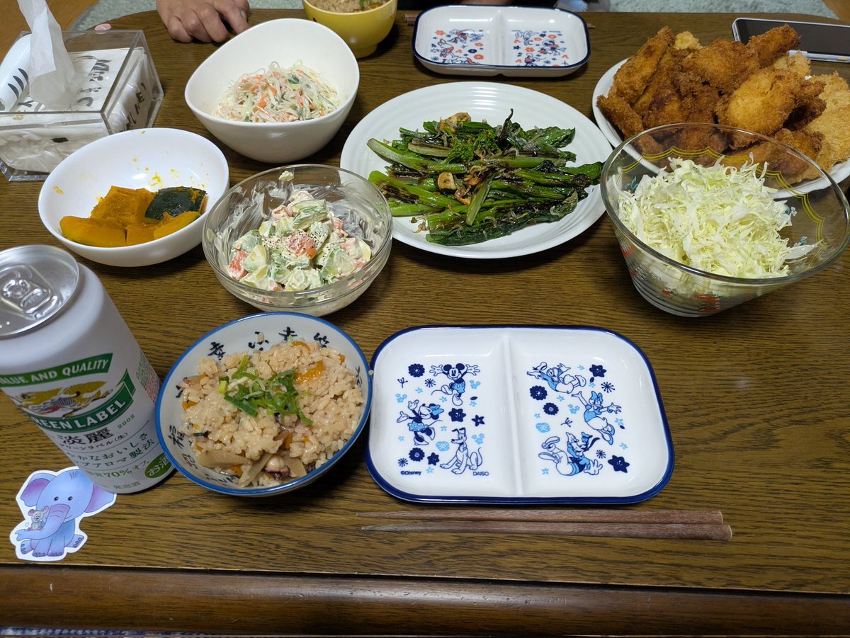 #今日の夕ごはん 午後休みの妻の当番 フライ3種 鶏むね,蓮根,はんぺん アスパラ菜の しらすガーリックオイル炒め アボカドサーモン 残り物 2品 炊き込みご飯 食べ過ぎた😌 pic.x.com/bOuafc8izX
