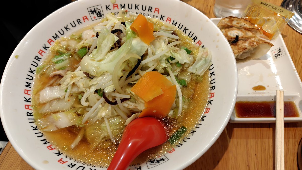 #今日の夕ごはん #京都駅 前の地下街 #京都ポルタ 内「#どうとんぼり神座」で、#野菜いっぱいラーメン と#餃子 1,080円+300円 麺はチュルチュル。スープはコンソメスープか。野菜がとても甘い。キャベツ、白菜、もやし、にんじん、きくらげ。そこにニラを加えて味変。 餃子も香ばしくおいしい。 pic.x.com/hrT0kQkF8H