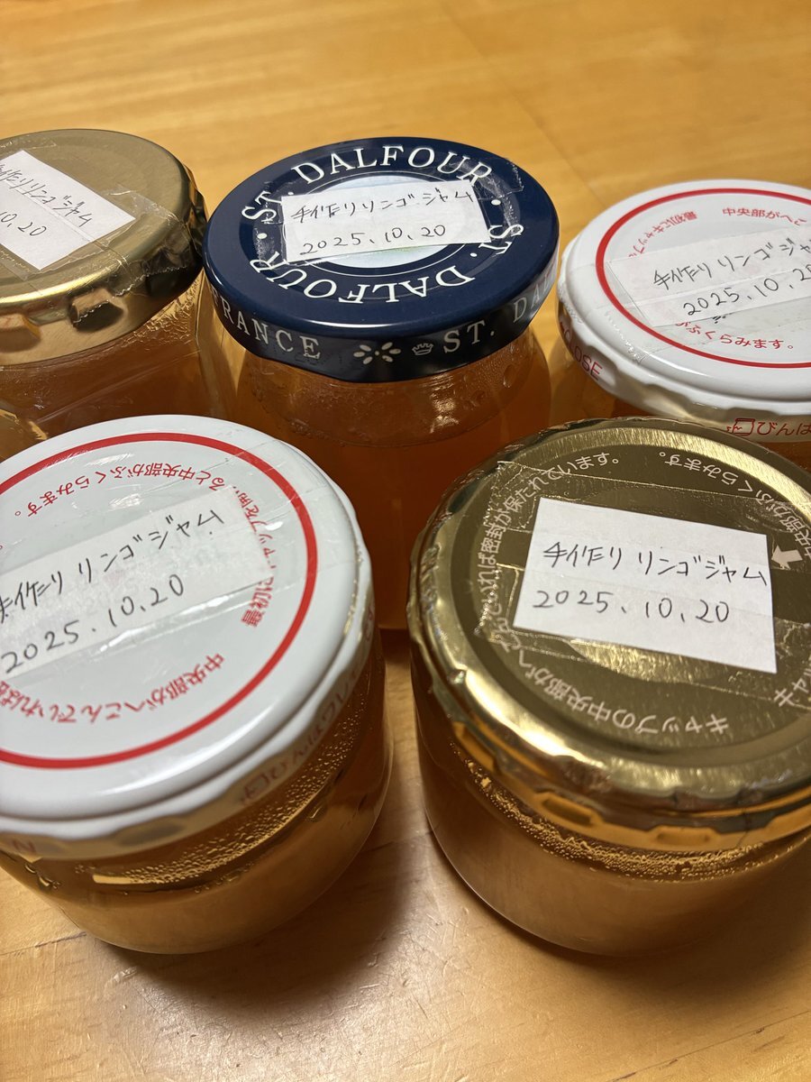 りんご屋さんで一袋購入したら、袋いっぱいに傷りんごを頂きました。今季2回目のりんごジャム作り。今回は搾りレモン入り。お裾分け用で小分けの瓶に保存。パンと一緒に差し上げても良さそう! #今日の手仕事 #りんごジャム pic.x.com/JVXOHTB73P