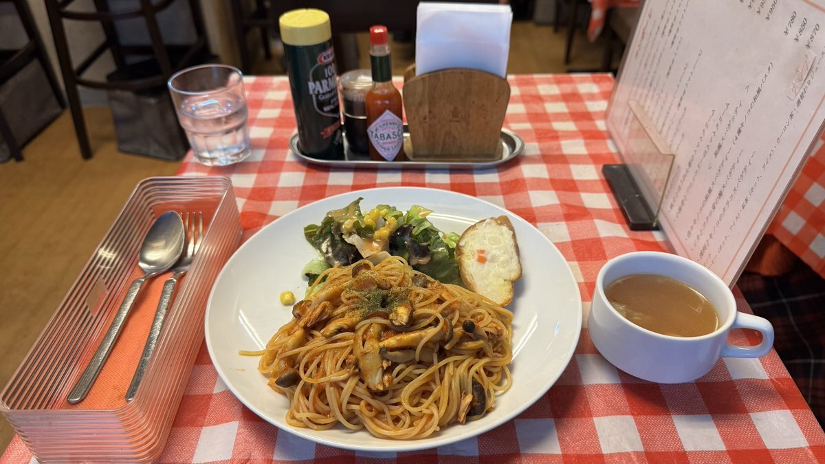 #今日の昼食 は、いつものスパゲテ ィー屋さんへ😃 #ツナとキノコのスパゲティー (トマトソース)を注文。 ドリンク付(ホットコーヒーをチョ イス)で美味しくいただきました😋 #昼食 #昼ごはん #ランチ #定食 #スパゲティー #パスタ pic.x.com/iCr6JLak8A