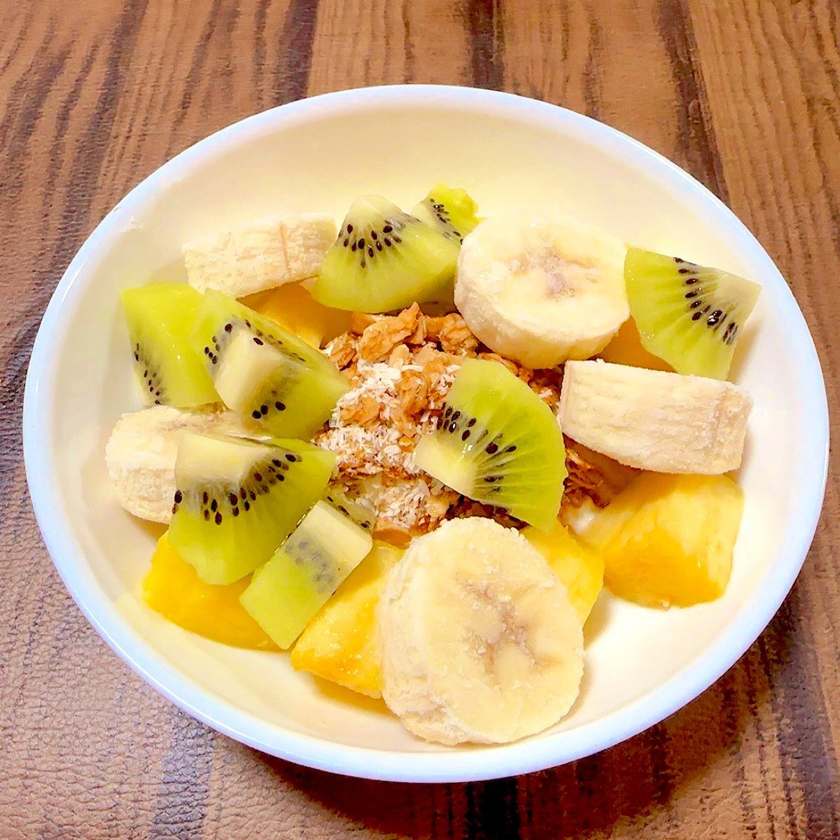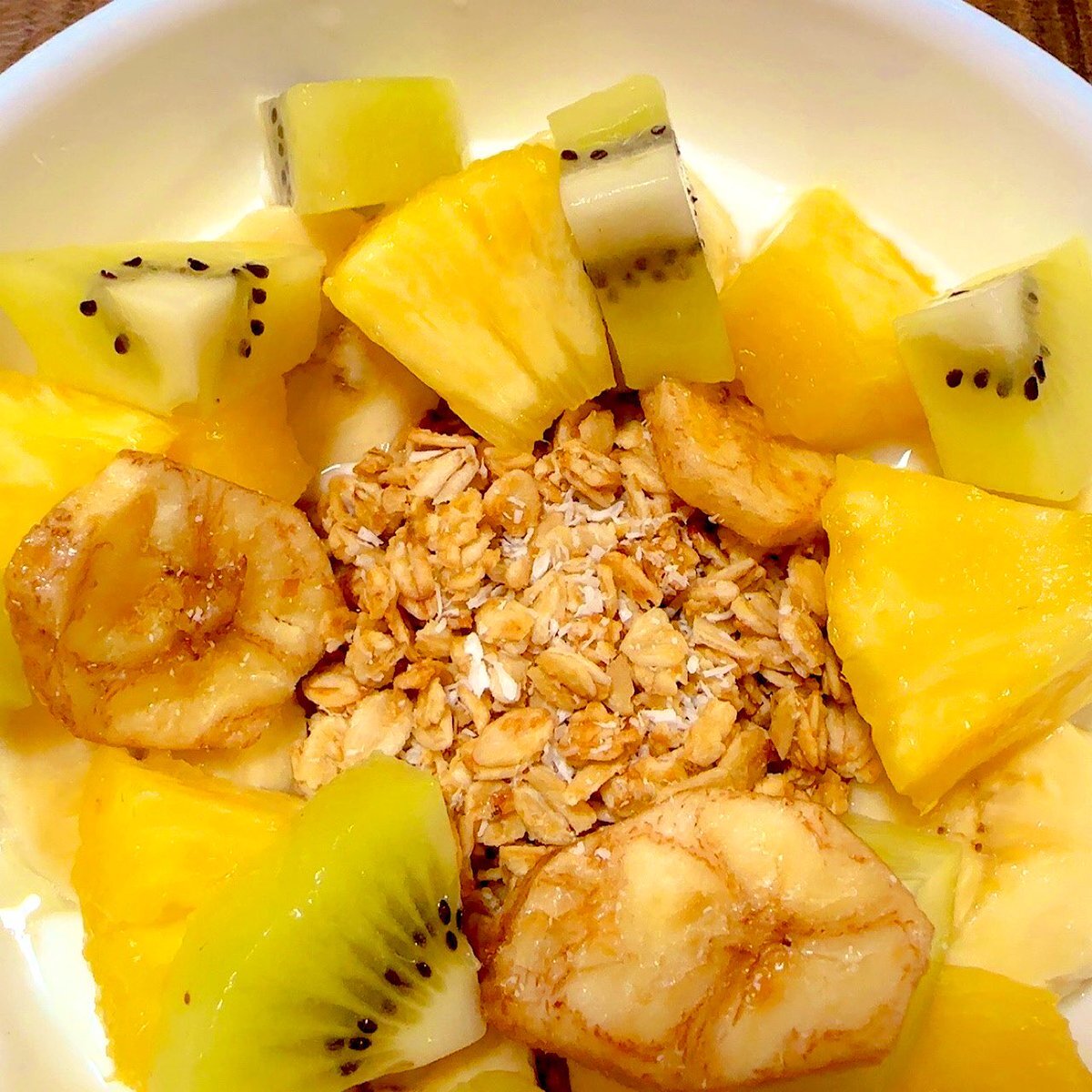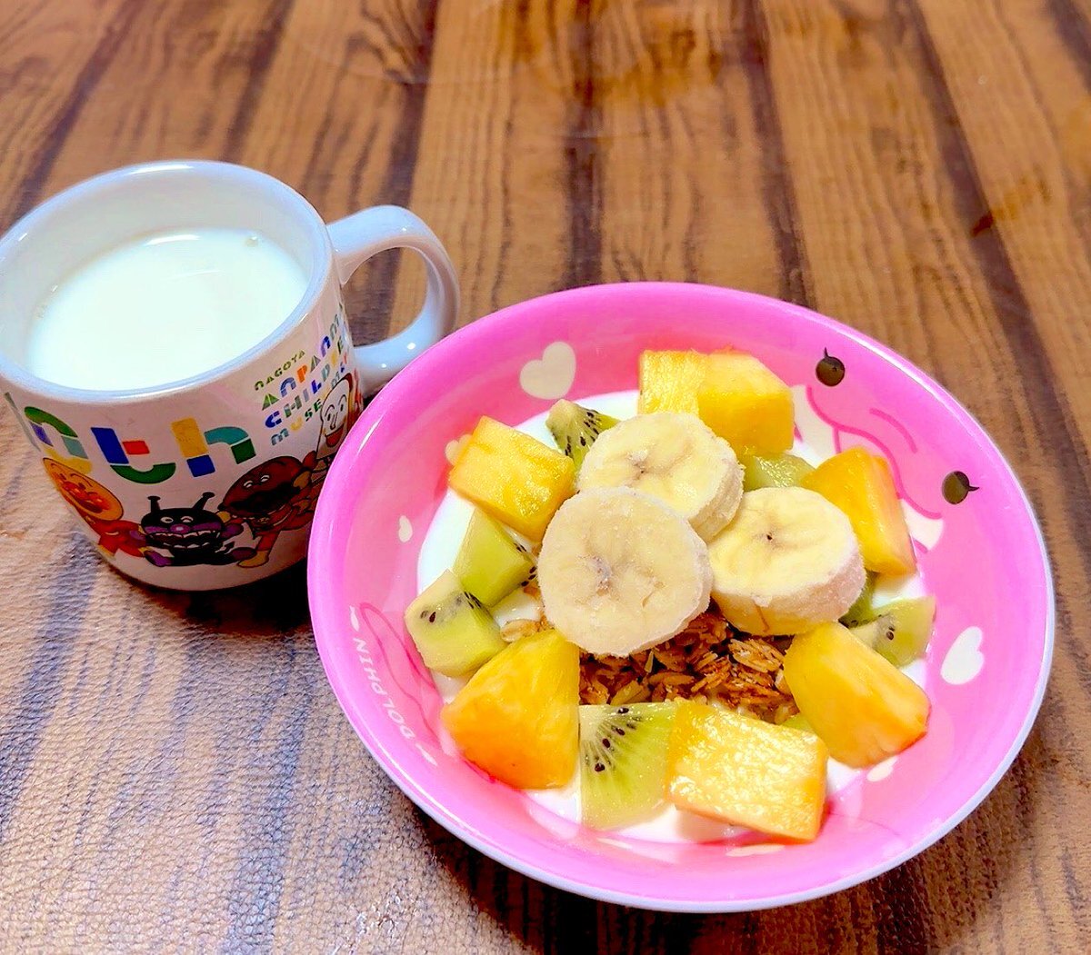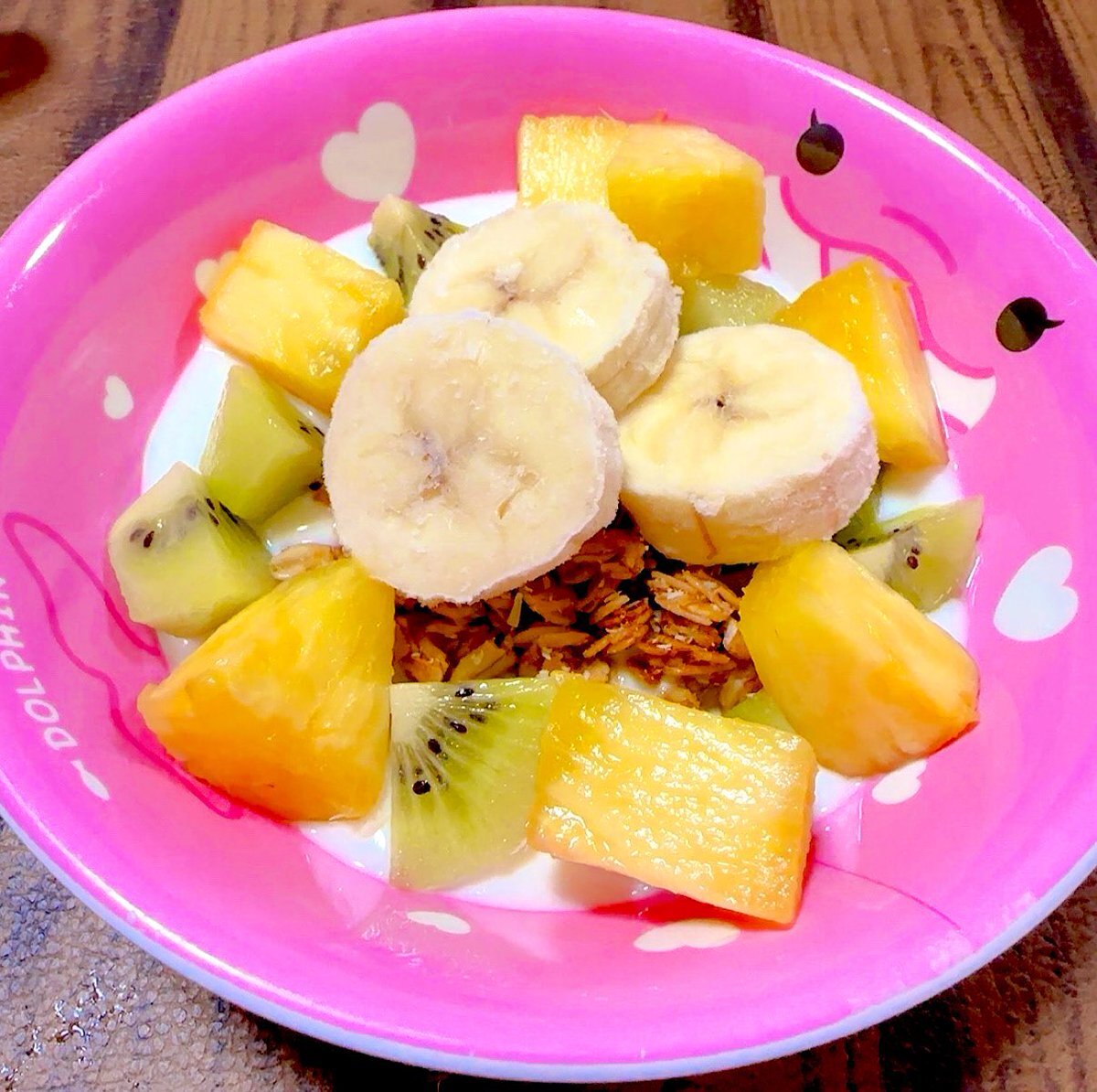 おはようございます 今日の朝ごはんです 天使ちゃんのご希望どおり ヨーグルト米麹グラノーラボウルの 朝ごはんです フルーツは、バナナ.キウイフルーツ. パイナップル 天使ちゃんは、酸っぱいというので ゴールドキウイにしました 今日も美味しく頂きました😋 #今日の朝ごはん #米麹グラノーラ pic.x.com/5fsOCum7UX