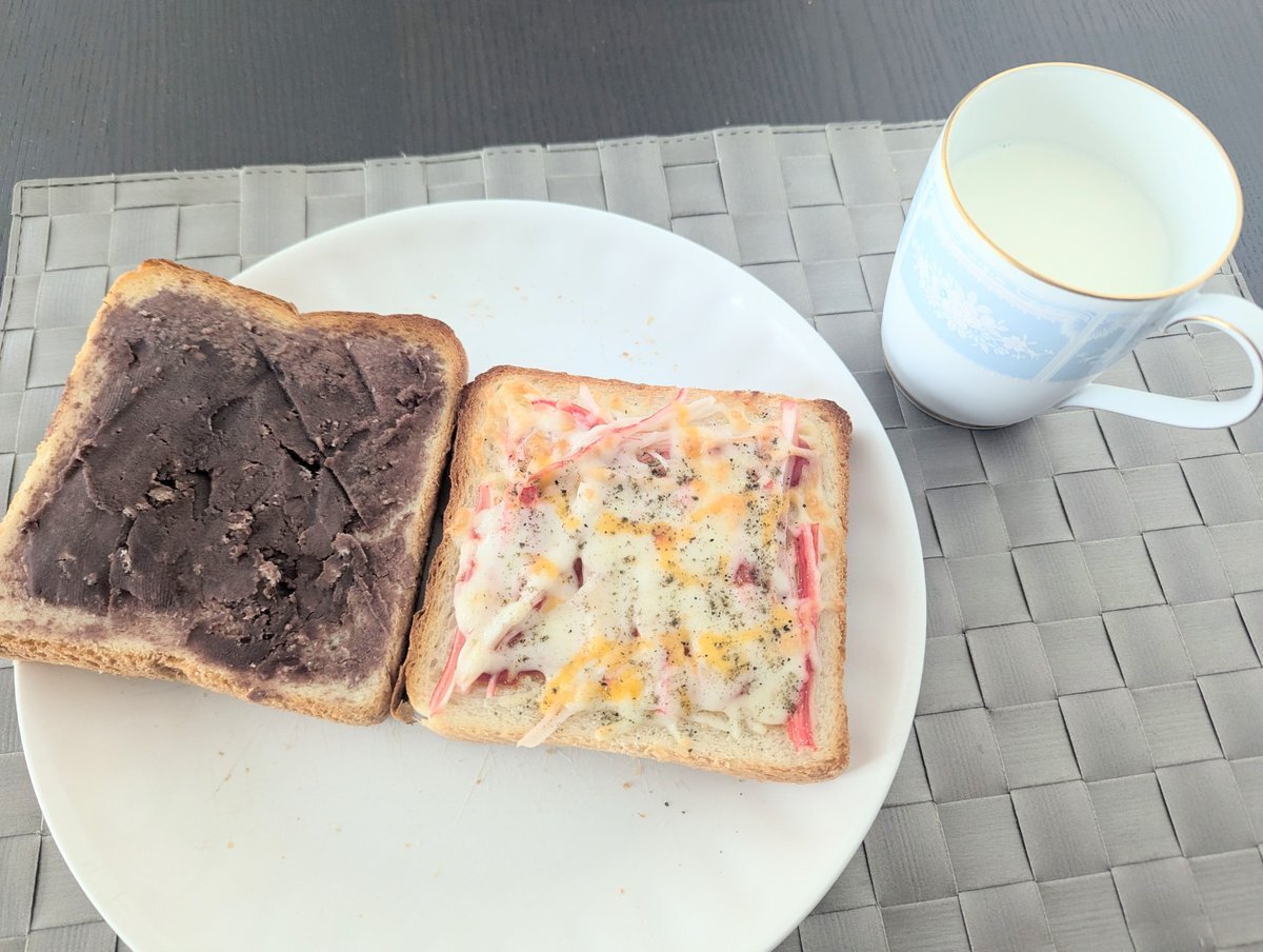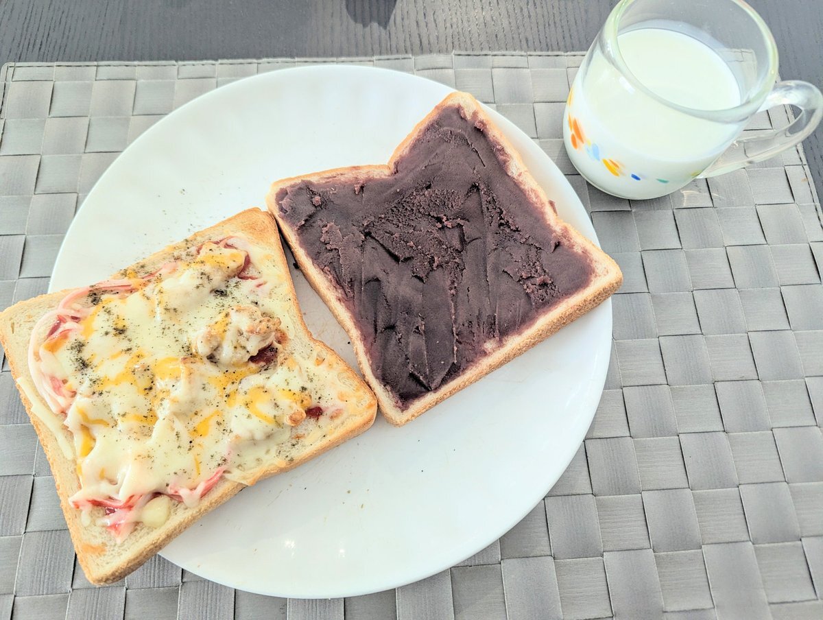 今日の朝ごはん🌞 国産小麦のもっちり食パン x2 牛乳 左は、あんこのみでトースト🔥! 右は、マヨ+ケチャップ+かにかま+チーズでトースト🔥仕上げに山椒をふって💨 業スーのあんこ、中国産だけど意外と美味しい😋 #今日の朝ごはん pic.x.com/aCXXS1XxSX