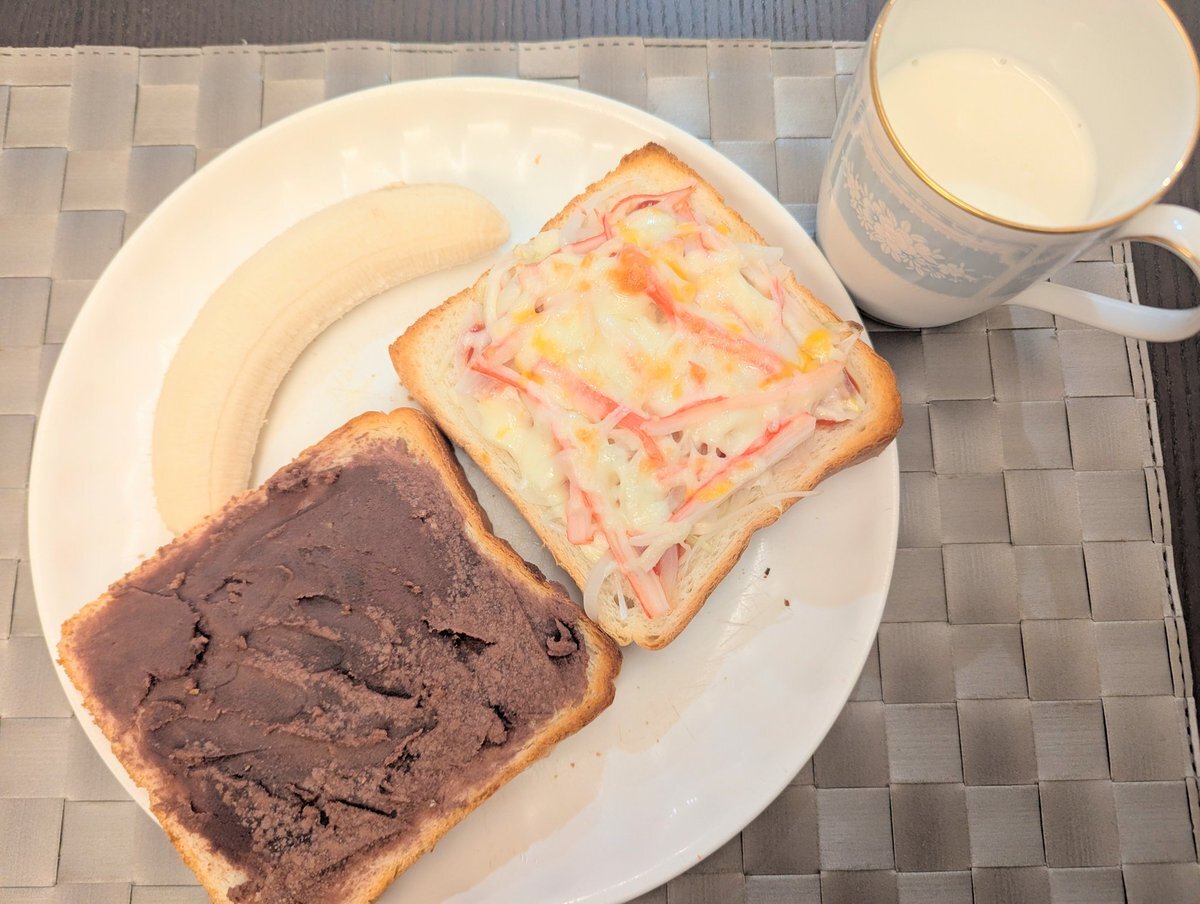 今日の朝ごはん☁️ 国産小麦のもっちり食パン バナナ 牛乳 右のパンは、マヨ+ケチャップ+玉スラ+カニカマ+チーズ+山椒でトースト🔥 左は、あんバターやりたかったけど、バターが高いので、あんトースト🍞 #今日の朝ごはん pic.x.com/N1HAr2dvV7