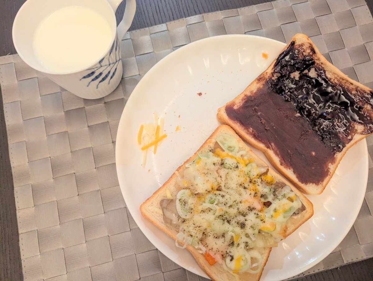 今日の朝ごはん☀️ ロイヤルブレッド x2🍞 牛乳🥛 手前は、もつ煮トースト🔥 マヨ+もつ煮+チーズ+薬味ネギ+山椒💨 奥は、あんことチョコジャムのハーフ&ハーフ🍫 #今日の朝ごはん pic.x.com/u0XO0AyAdp