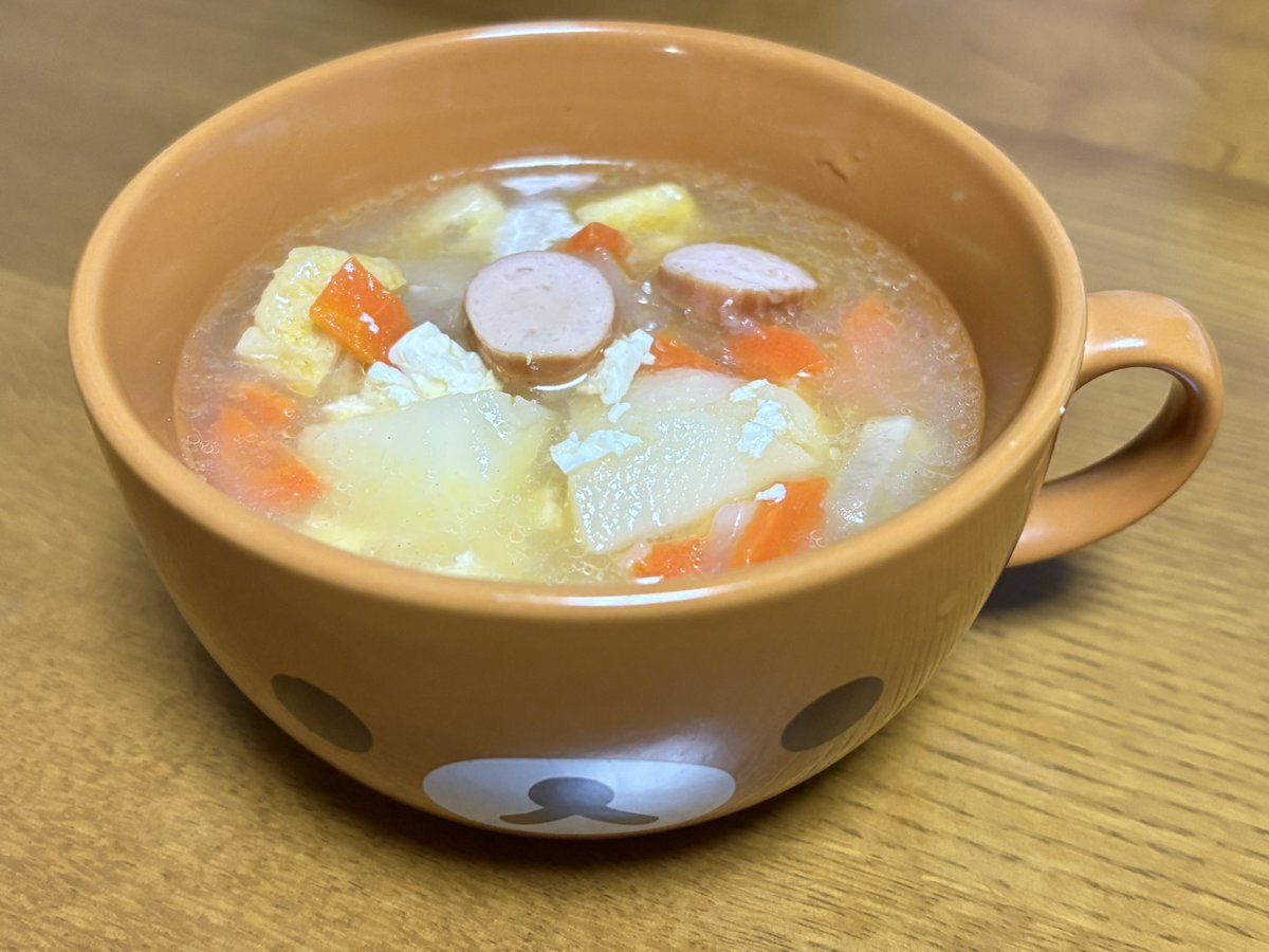 「豚汁作ろうか」って言ったら「こないだのソーセージ汁食べたい」と言うので粗挽きソーセージを買ってきました。シャウエッセン、大根、🥕、🥔、里芋、蒟蒻、油揚げ、豆腐です。大根と🥔は娘が切ってくれました。美味しい😋 #猫がいる幸せ #今日の朝ごはん #ソーセージ汁 #猫の手貸してくれてる🐾 pic.x.com/sfRpXBwUw5