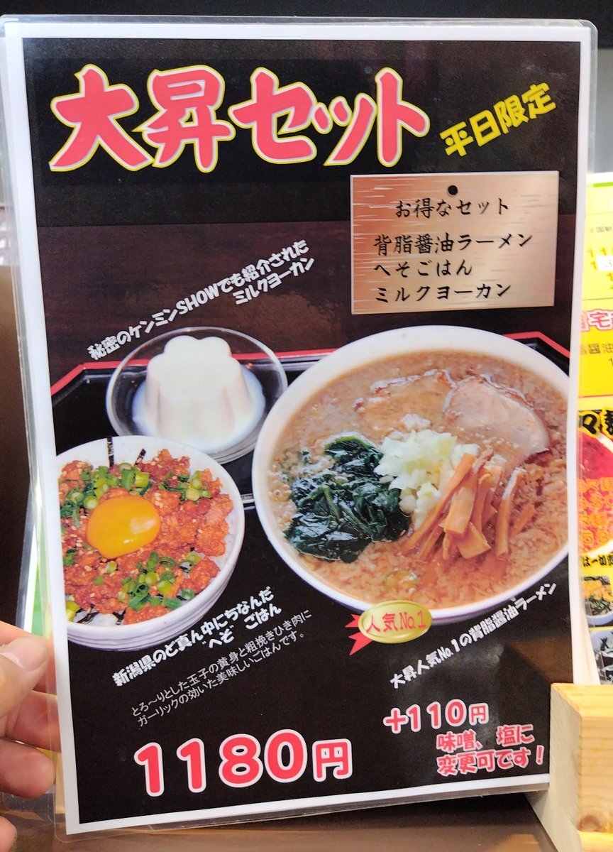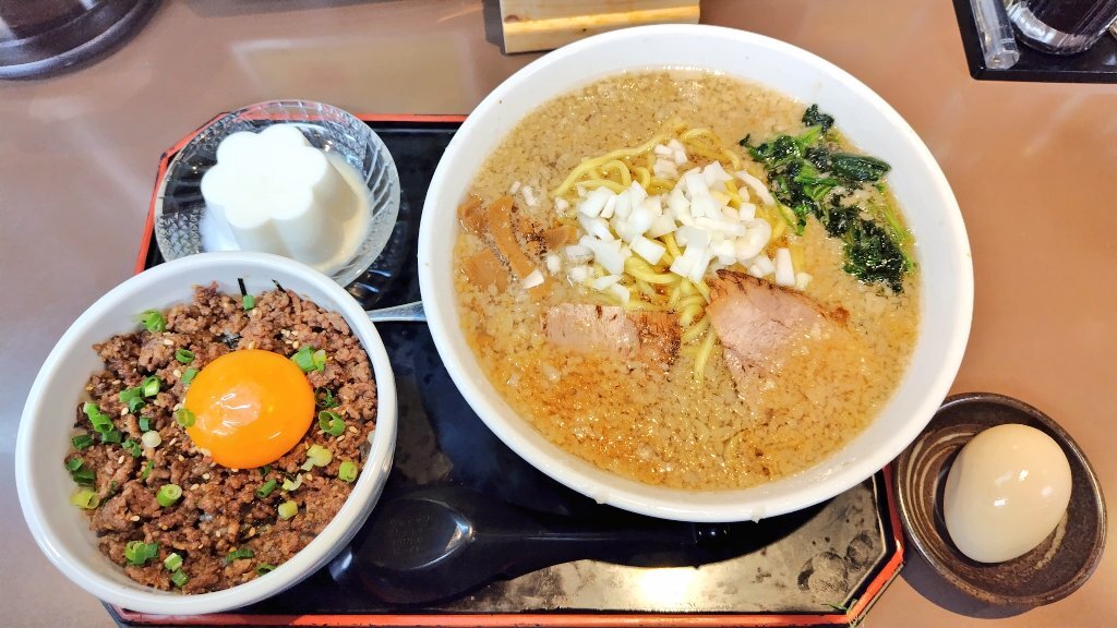 #今日の猛毒 大昇セット※平日限定¥1,180+とろりん玉子(半熟煮玉子)¥0(RA-PASS特典¥110相当)[麺処大昇 見附本店 新潟県見附市] しっかり麺、多めの背脂、歯ごたえメンマ、ホロホロ豚肉、醤油強めのスープ。ごはんの肉は挽かな🧄旨し!牛乳寒天アリかも maps.app.goo.gl/12TK4Yi5YWmpJC… #ラーメン 126 pic.x.com/MNpSH5B9KP