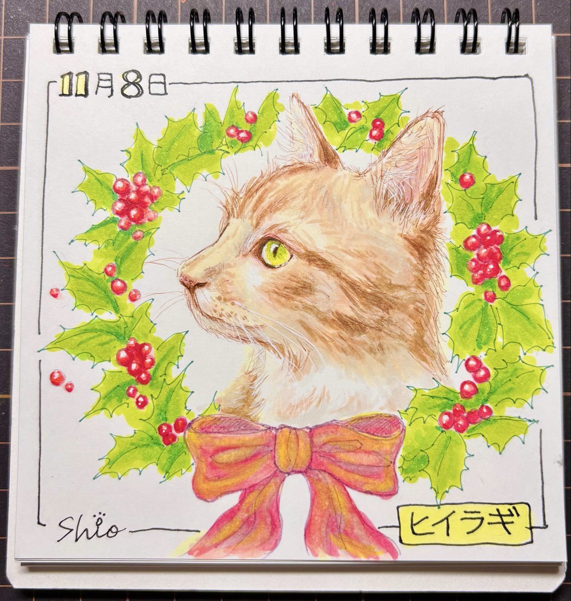 #今日の誕生花 ヒイラギ ヒイラギでリースを描きたくなり、中のにゃんこは節分から連想しました😉(柊→鰯の頭→🐈🐾) #コピック #コピックスケブスクエア pic.x.com/PS14bBRY36