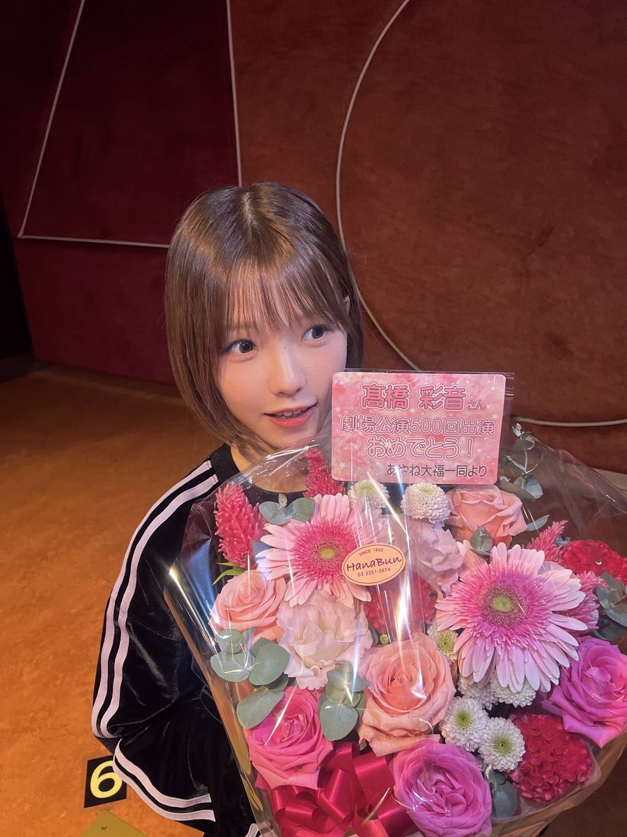 劇場公演出演回数500回を迎えました☺️ 素敵なお花ありがとうございます🌷 とっても嬉しいです🥹 500回も出てる事にびっくりしたのと、いつになってもこの劇場が公演が大好きだ!と実感しました 明日の501回目からも楽しもうね😊