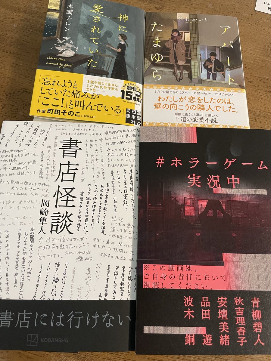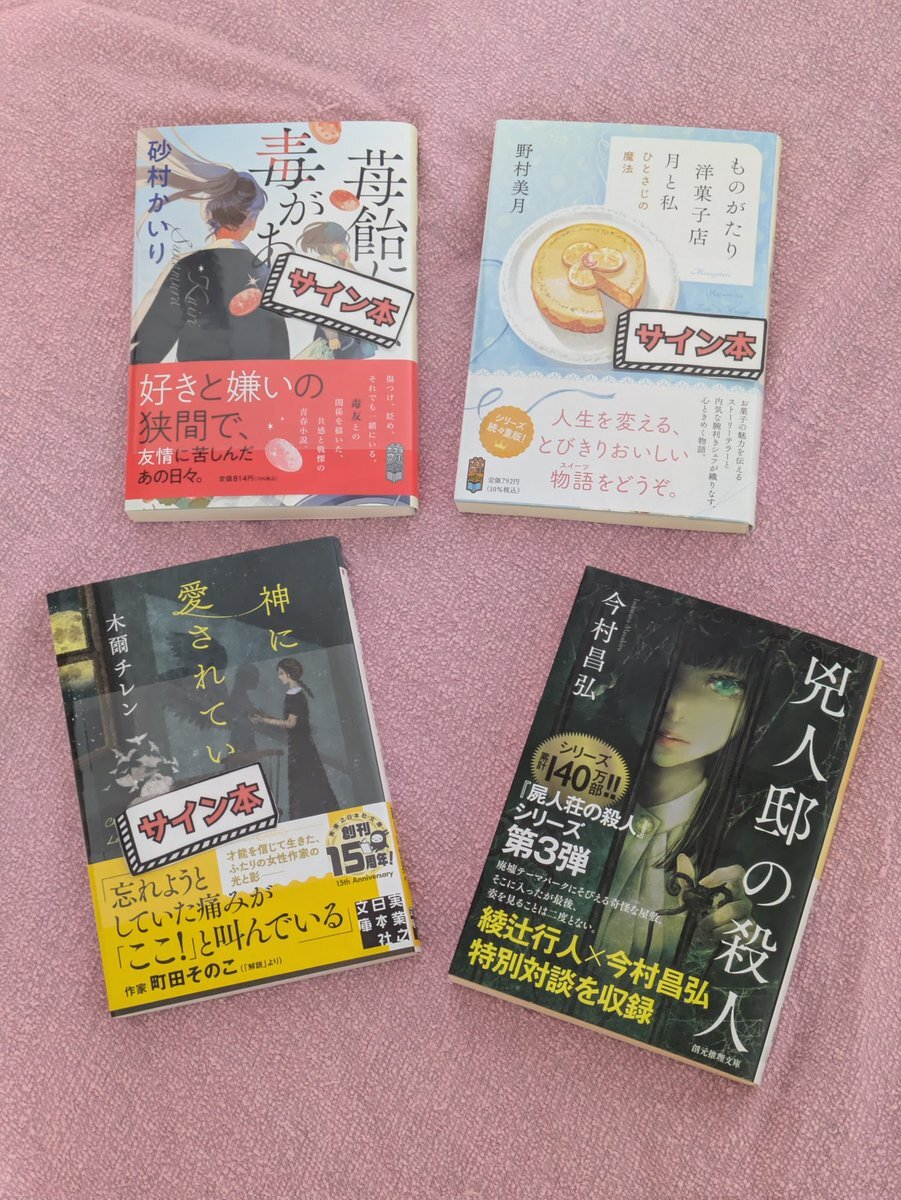木爾チレンさんの「神に愛されていた」のサイン本が入荷されたと聞いて、手元に1冊ありますが正和堂書店さんへ 月のスタンプが押されている本は当たりらしく内心小躍りしております(しかも900分の38らしい😳) 後、他にも気になっていた本をサイン本メインに購入 #今日買った本・届いた本を紹介する pic.x.com/knlYtnQ1hx